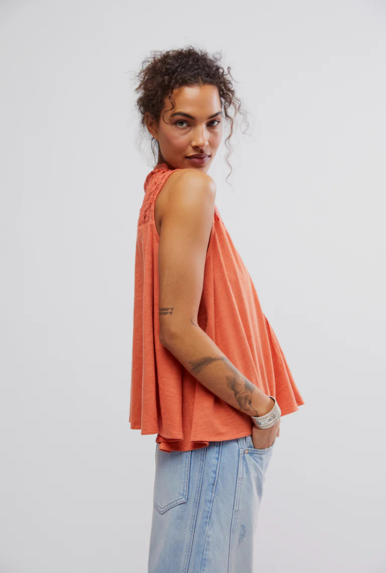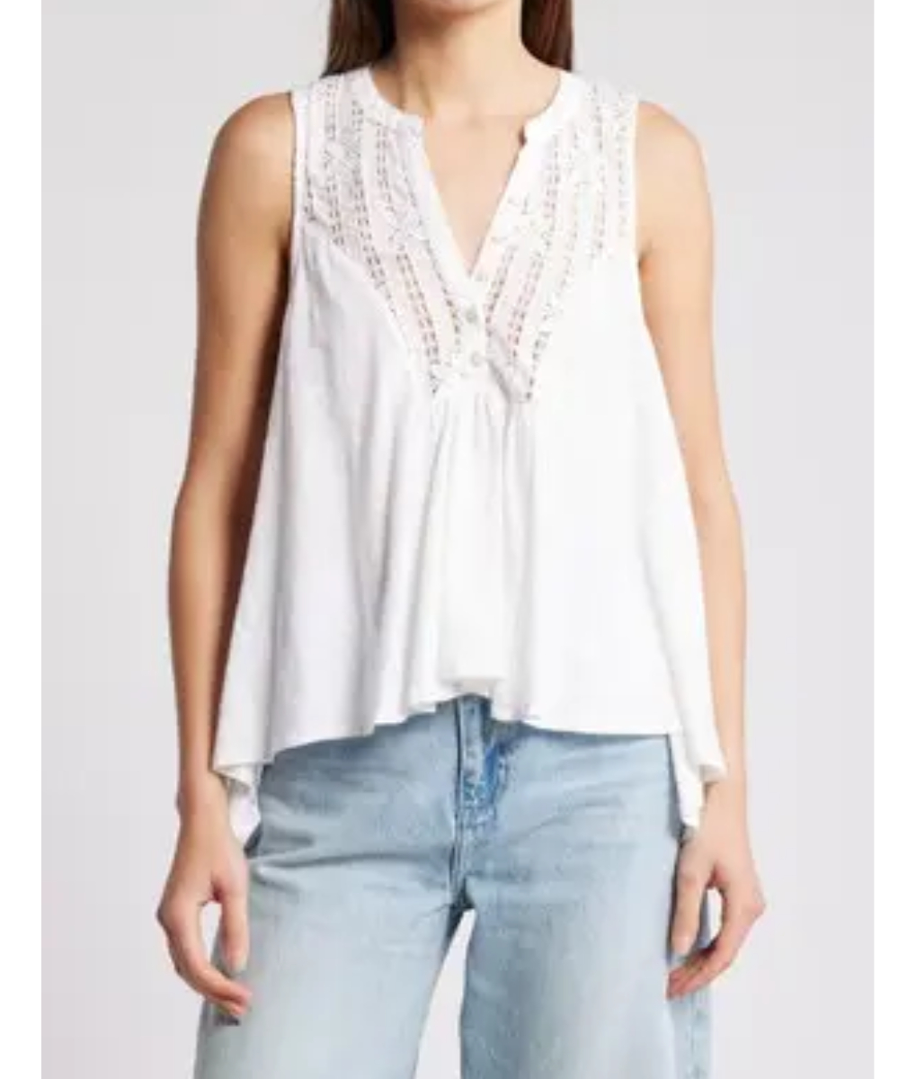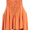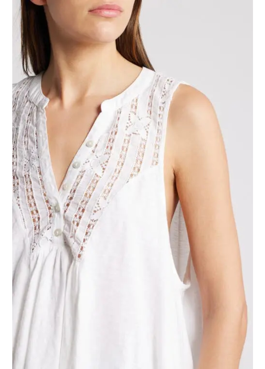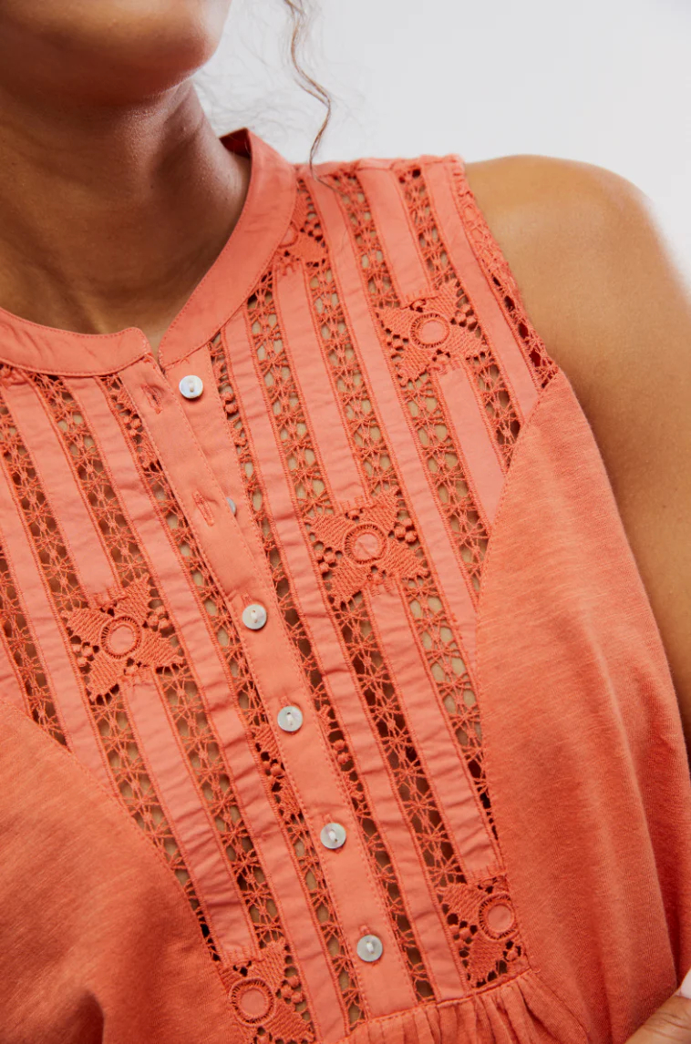 Esta blusa sin mangas, con su silueta babydoll y detalles de encaje, es una prenda básica versátil de inspiración vintage, perfecta para tu guardarropa de clima cálido.