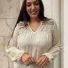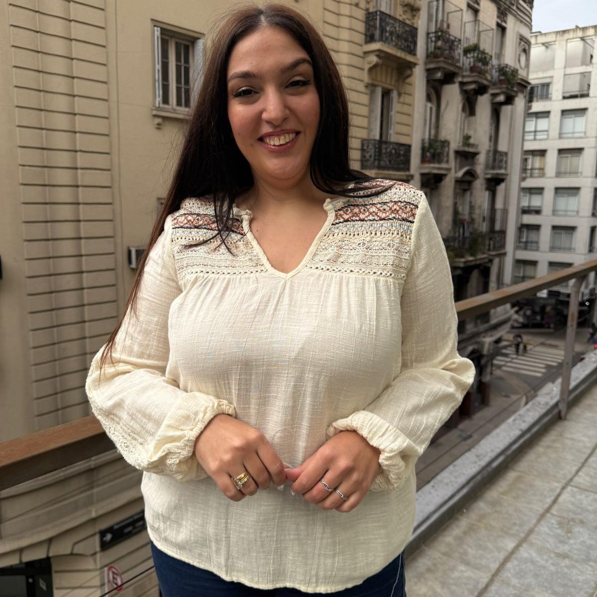 Blusa manga larga, cuello V, hombro bordado en hilo