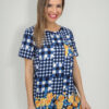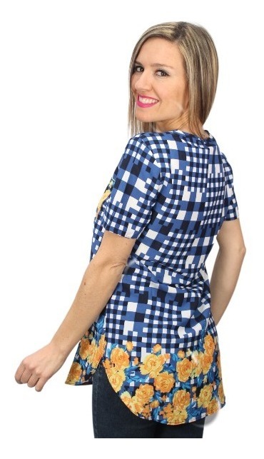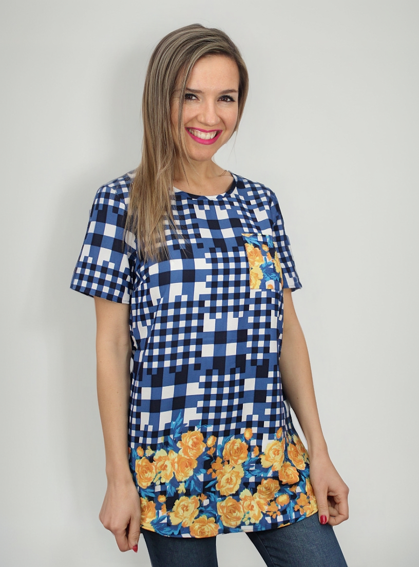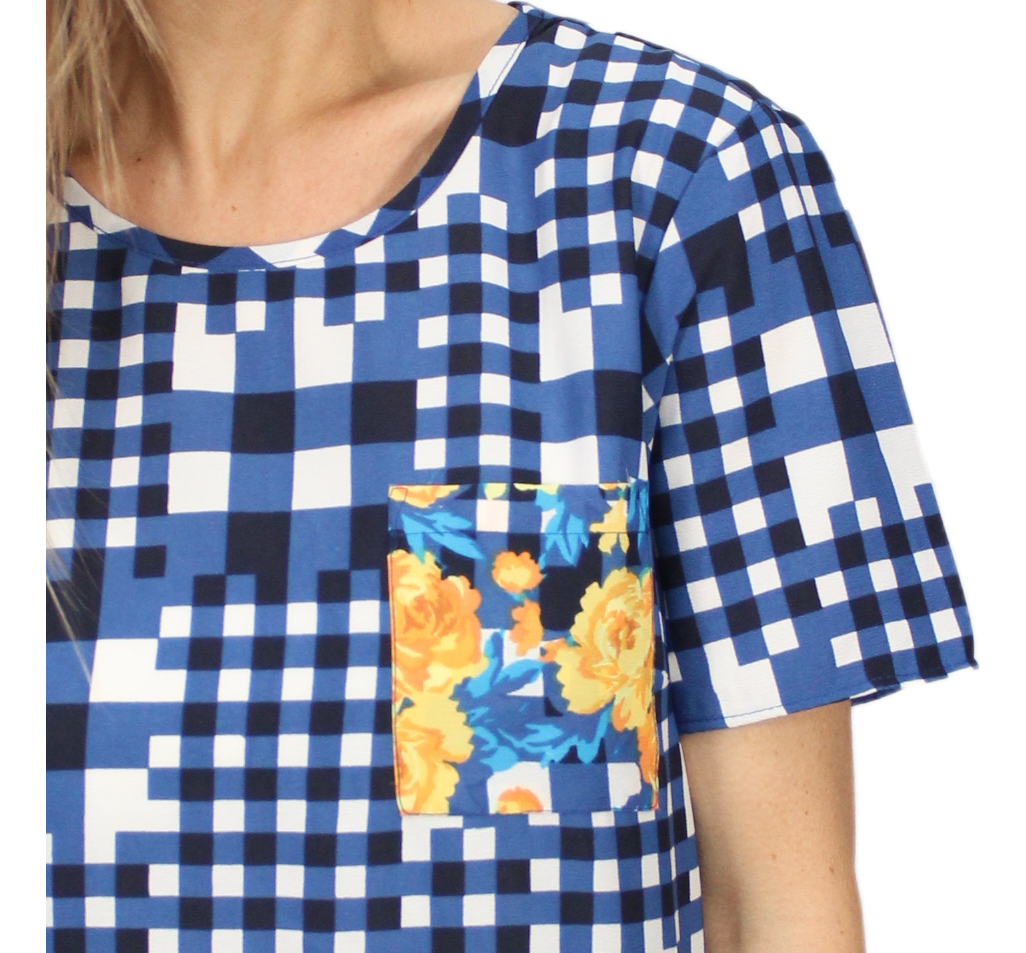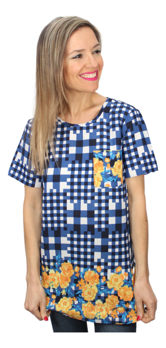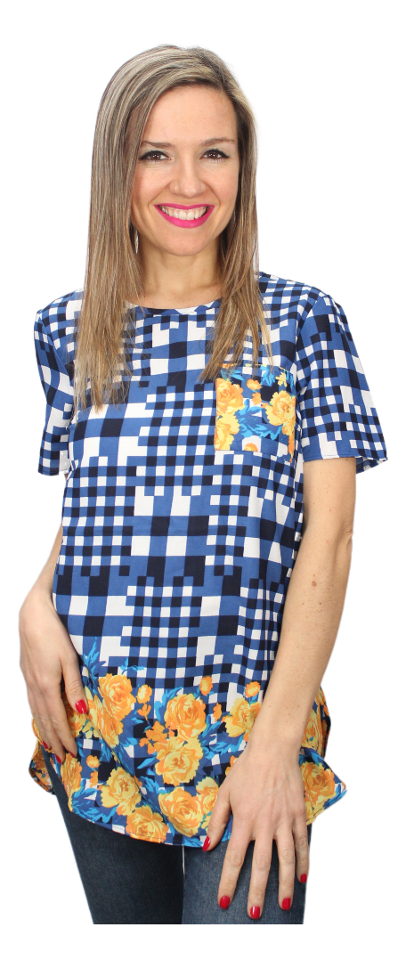 Blusa cuadrillé con bolsillo y flores amarillas.