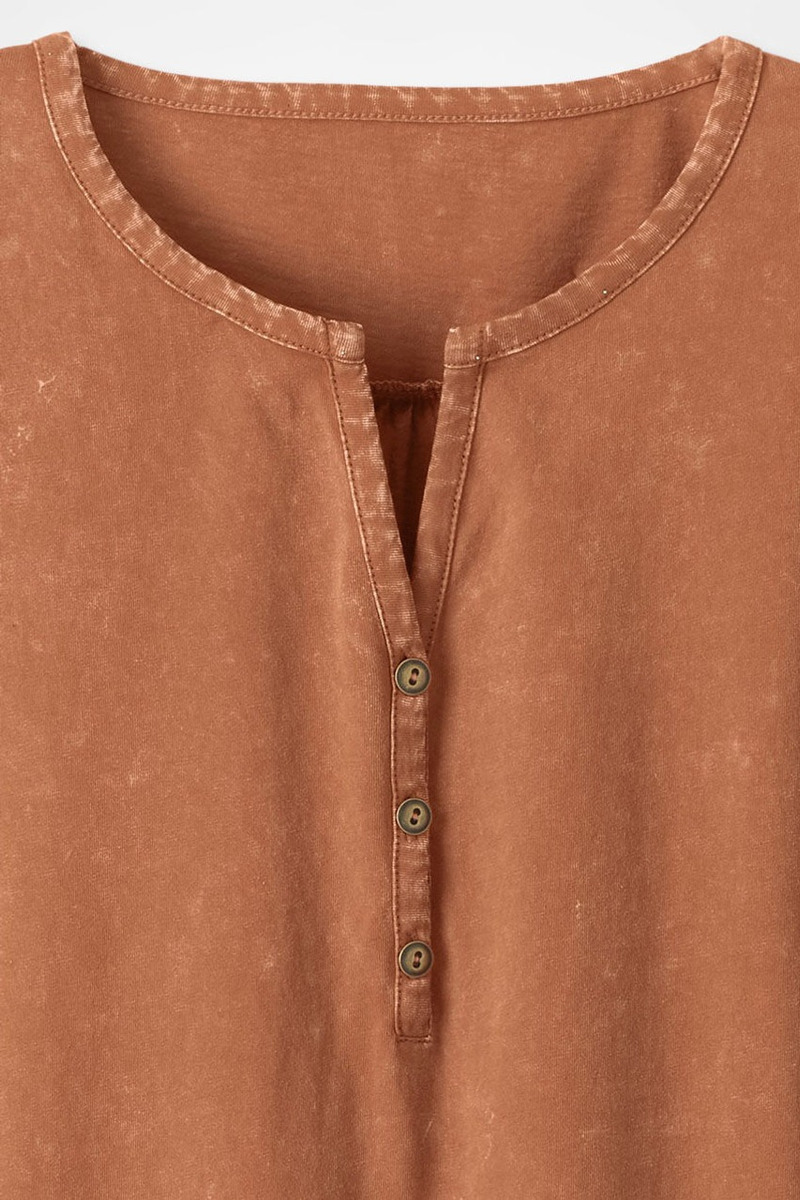 Nuestro tejido ligero tiene un aspecto desgastado y un tacto suave gracias a un proceso de lavado especial que crea sutiles variaciones de color únicas, lo que hace que cada camiseta sea única. Escote en V con botones metálicos o acrilico, canesú trasero fruncido y bajo redondeado.