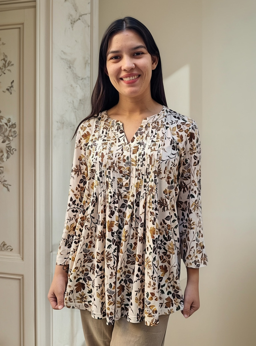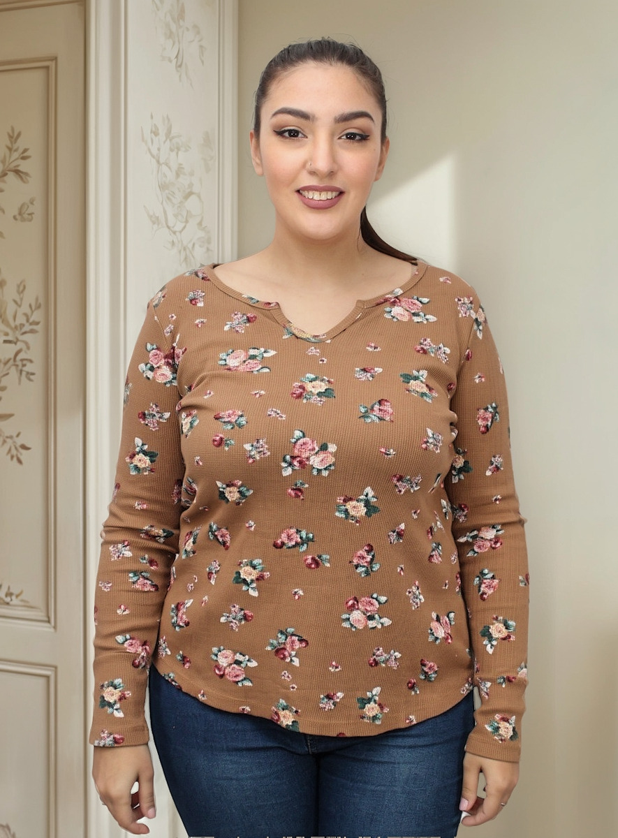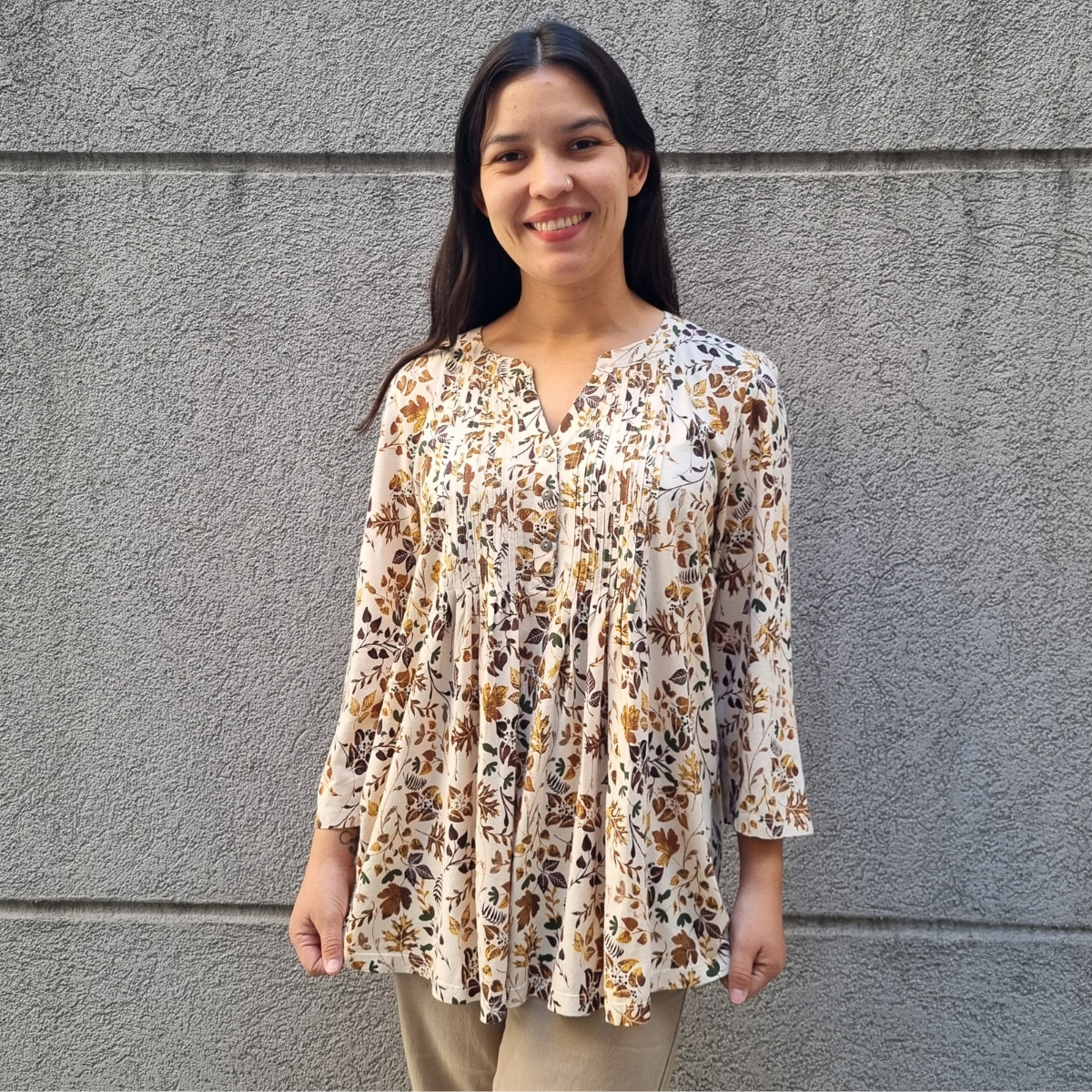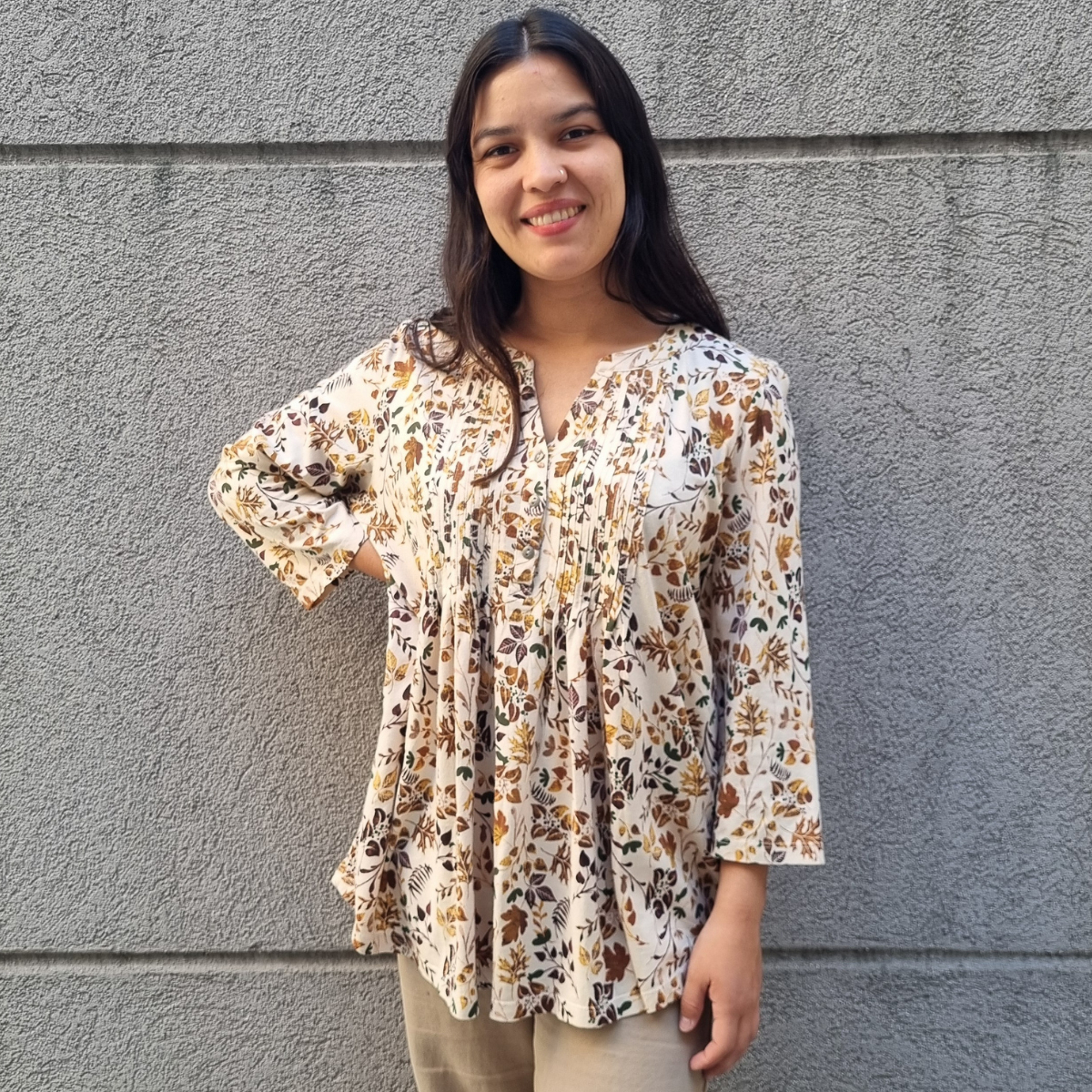 Blusa manga 3/4 con PLIZAS ESTAMPADO FLORAL cuello V