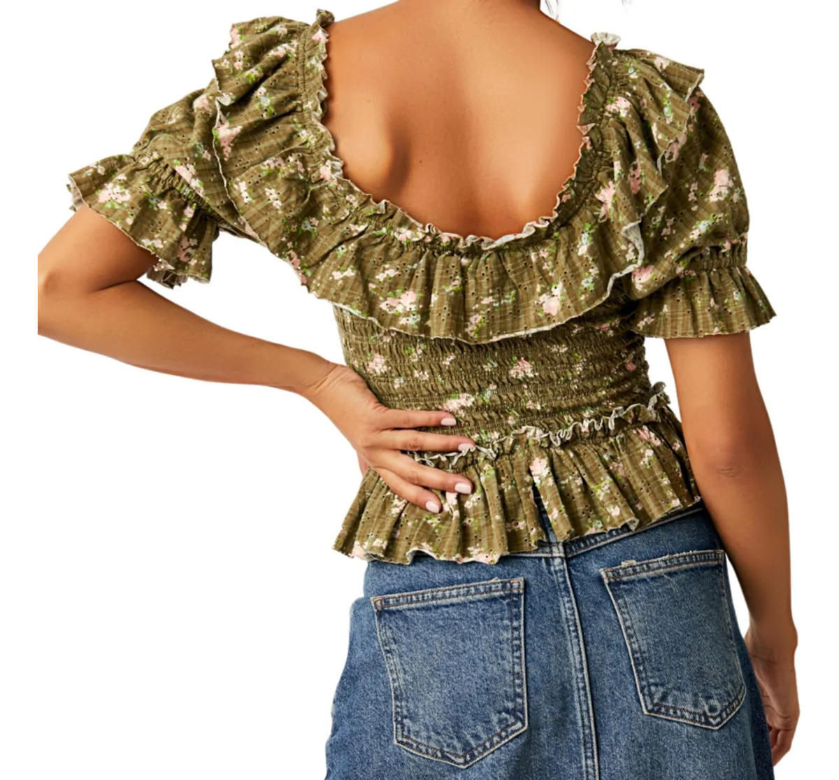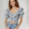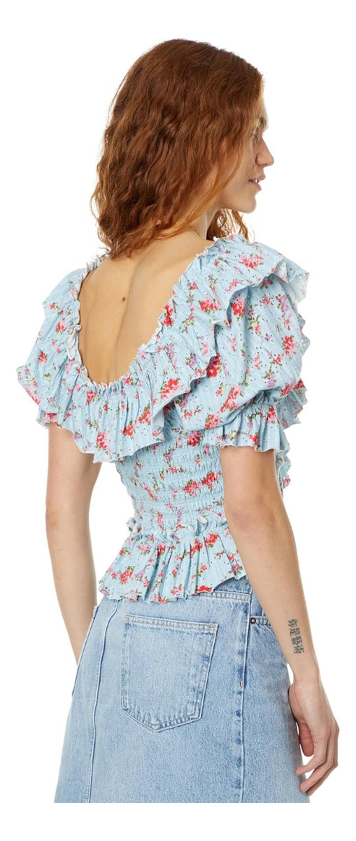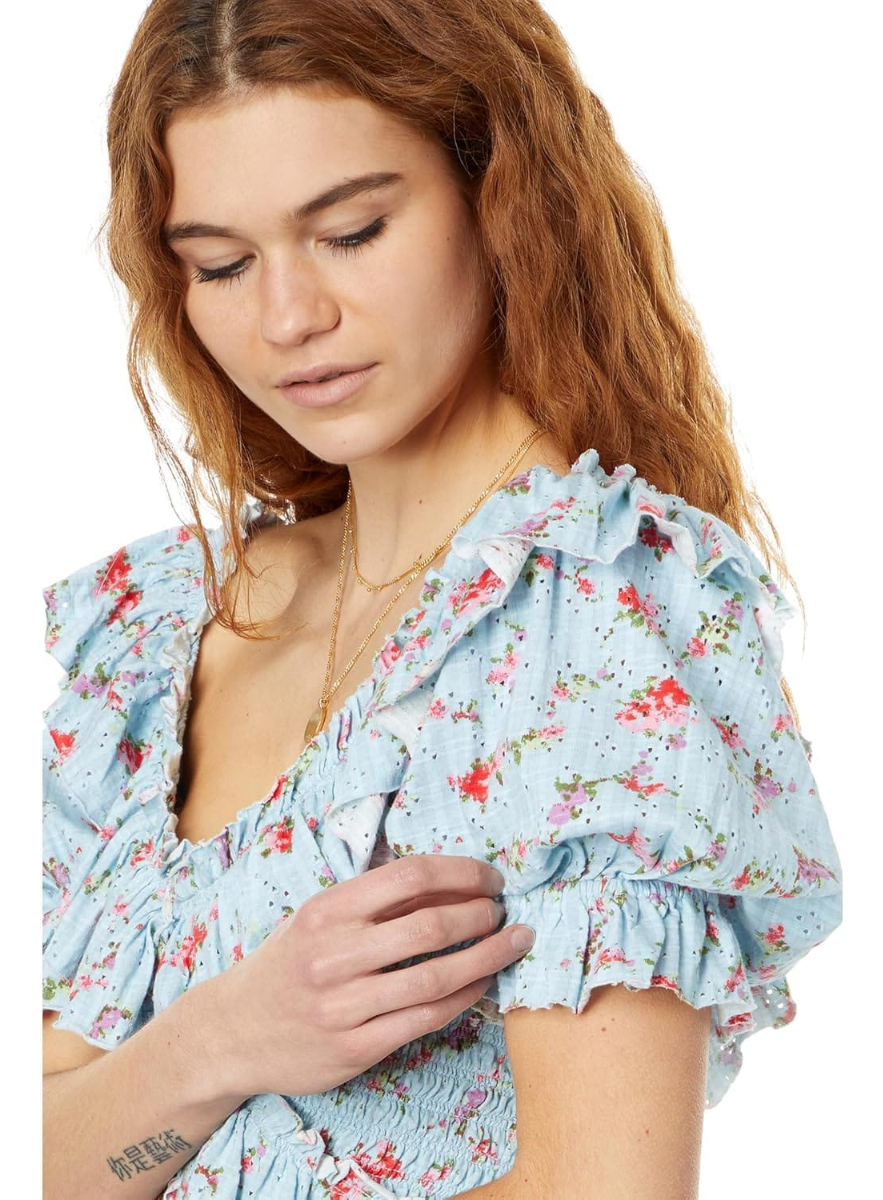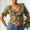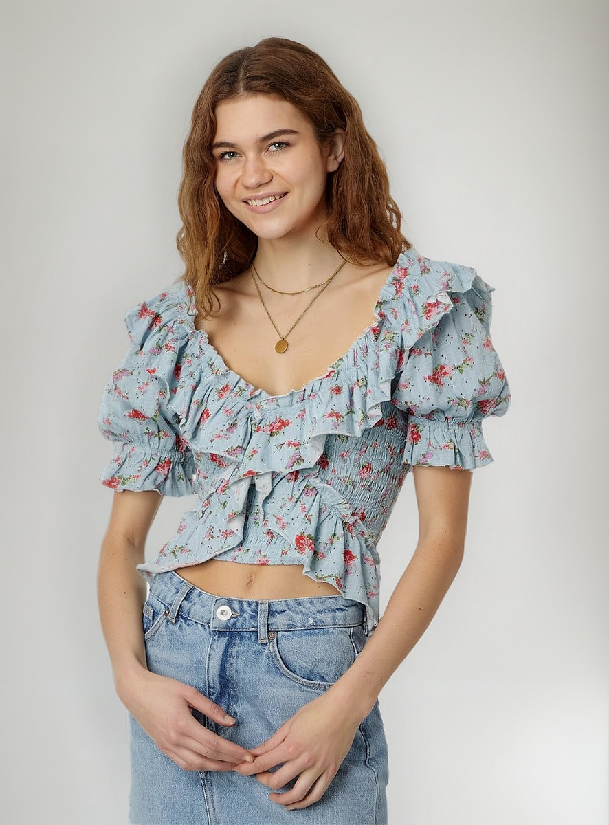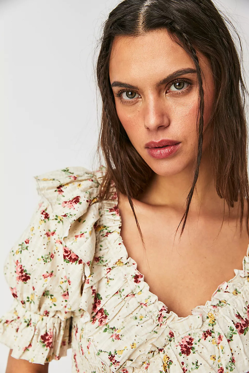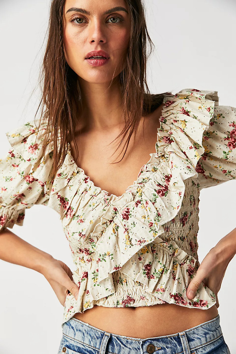 Acapará todas las miradas con este top atemporal con diseño cruzado y un estampado floral, con bolados exagerados y fruncido en el pecho.