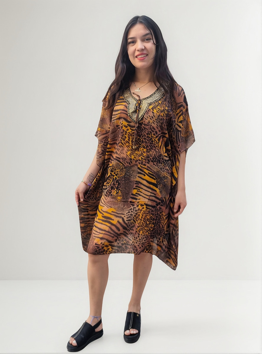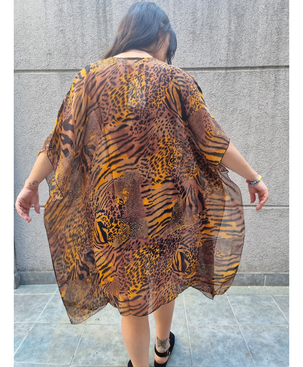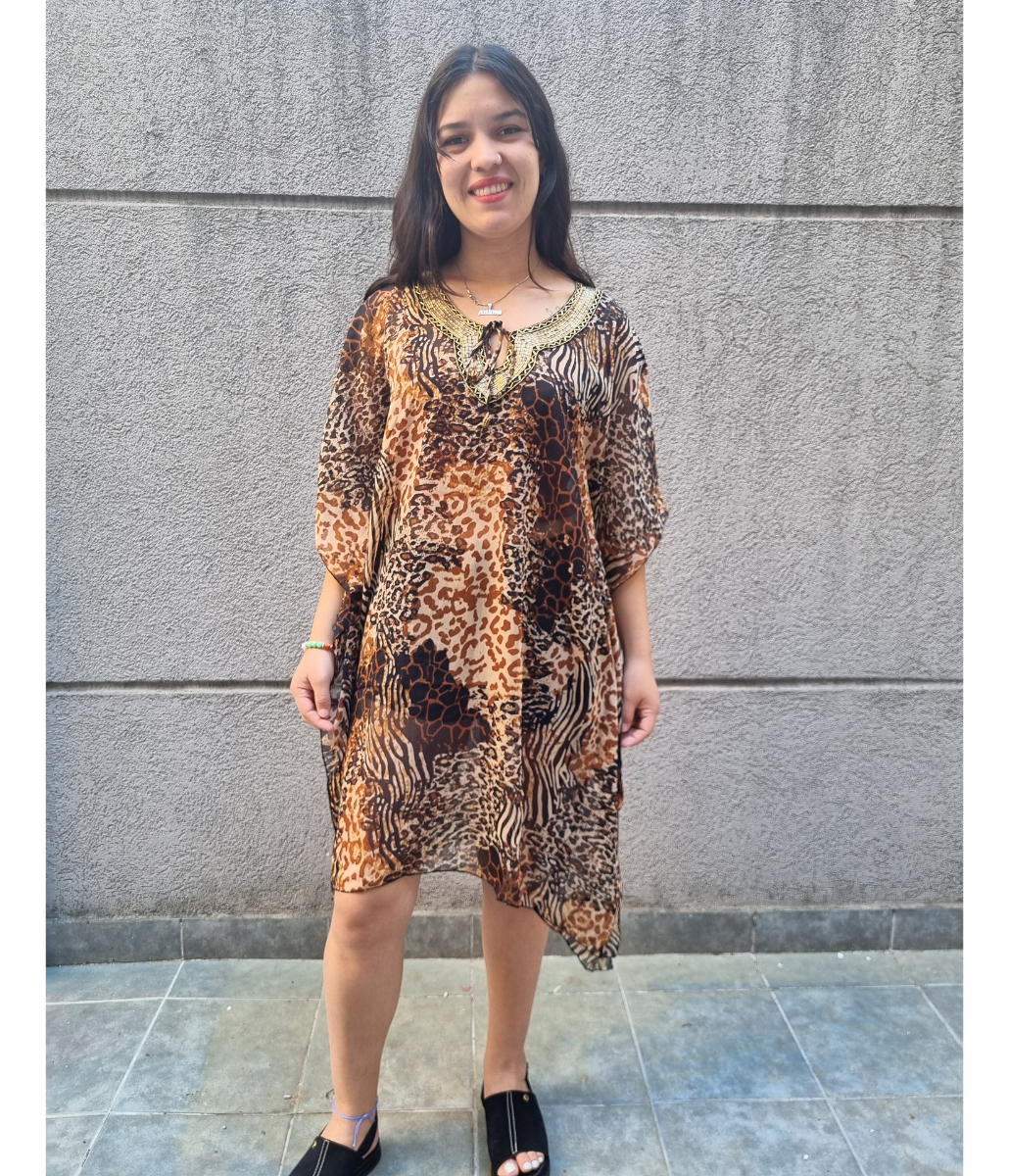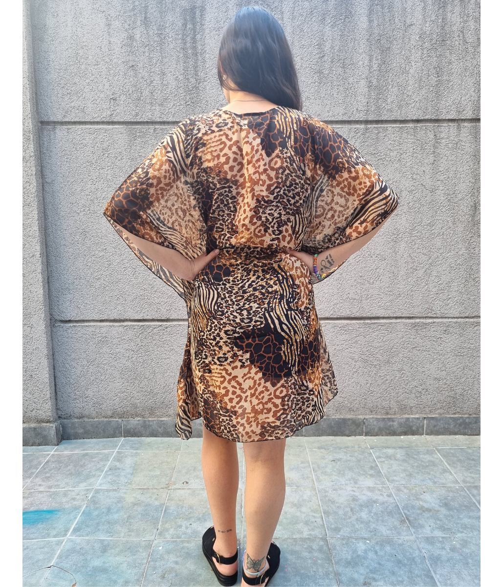 Blusa Vestido Poncho Animal Print cuello en V con canutillos