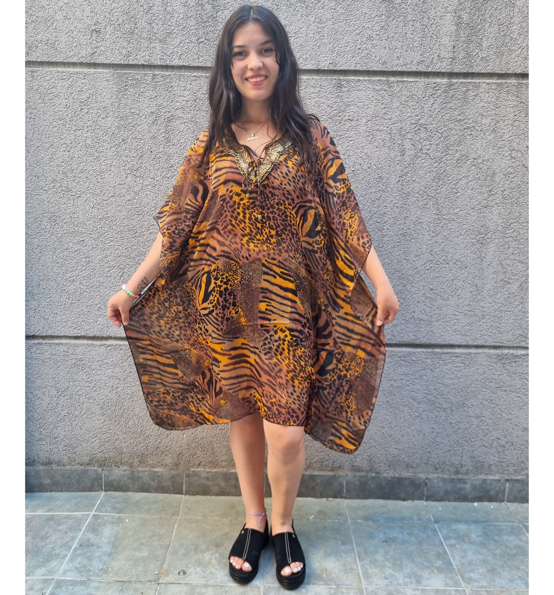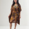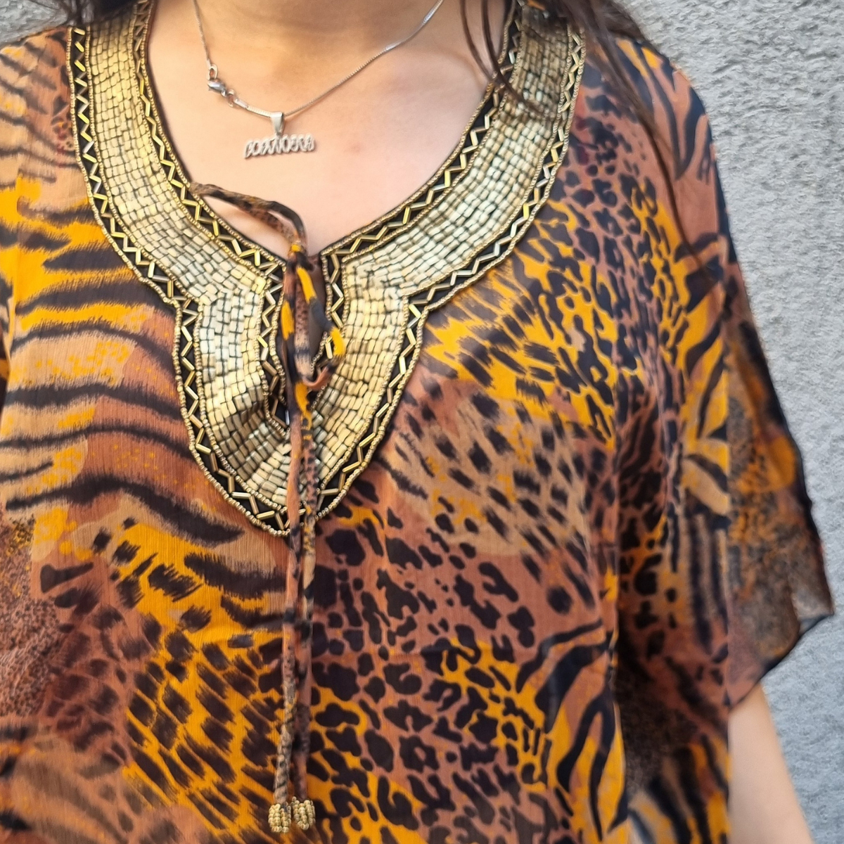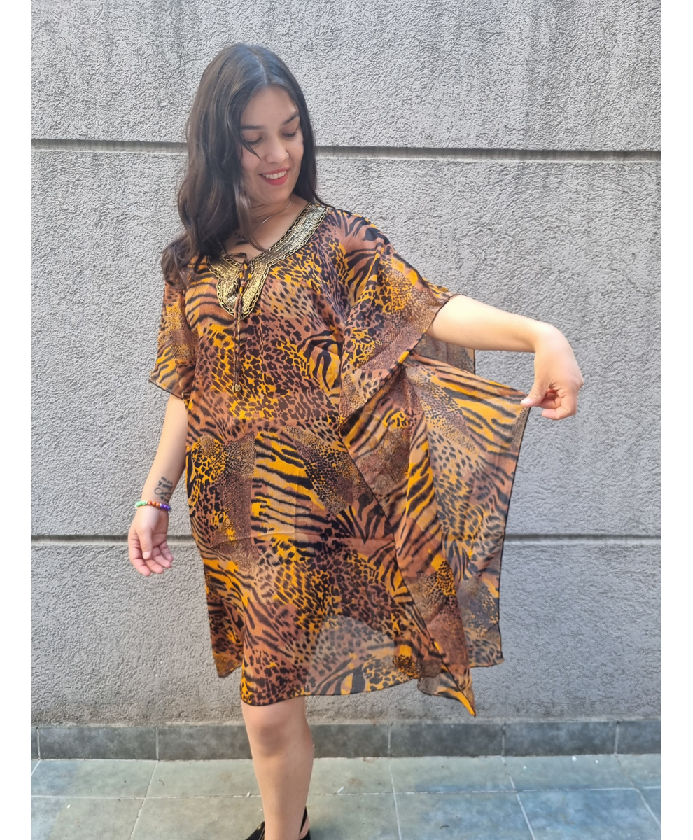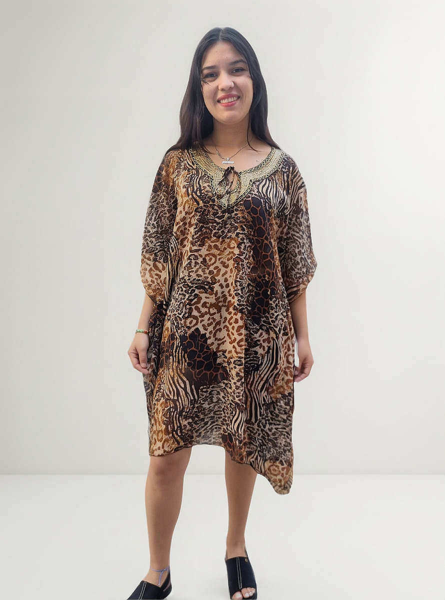 Blusa Vestido Poncho Animal Print cuello en V con canutillos