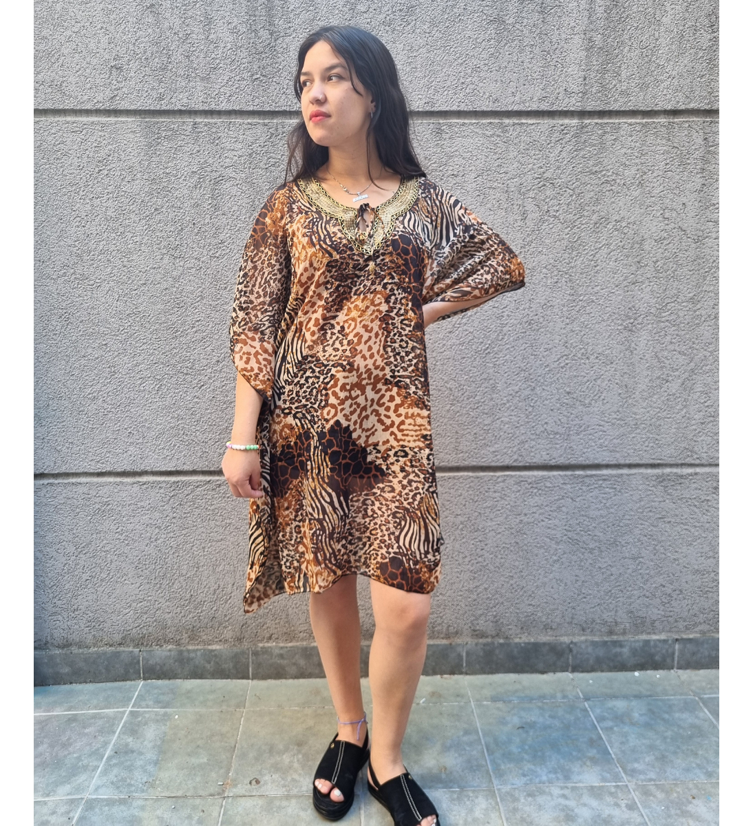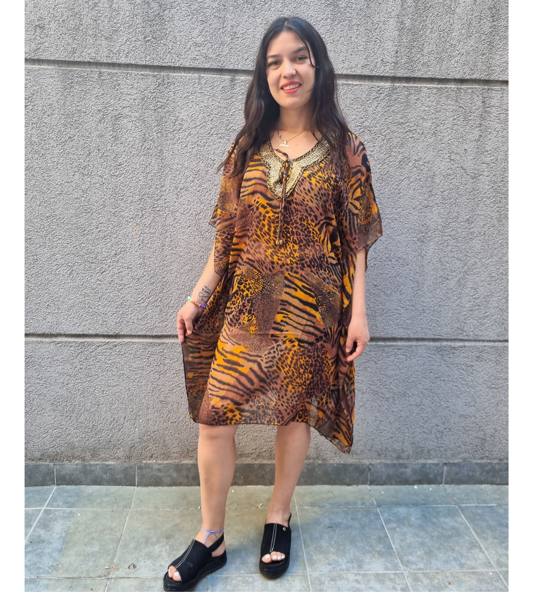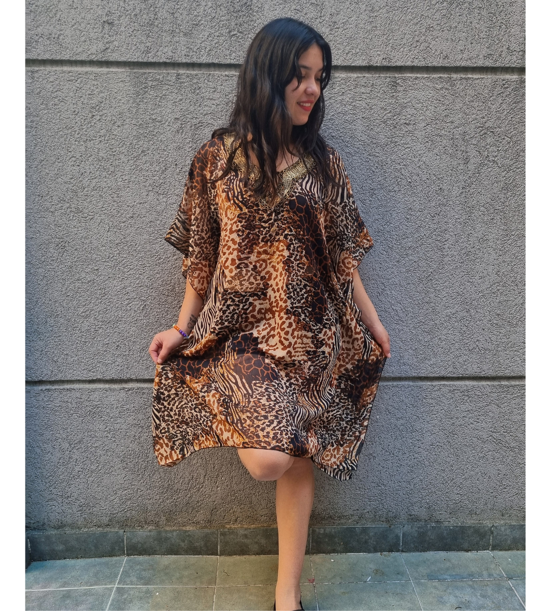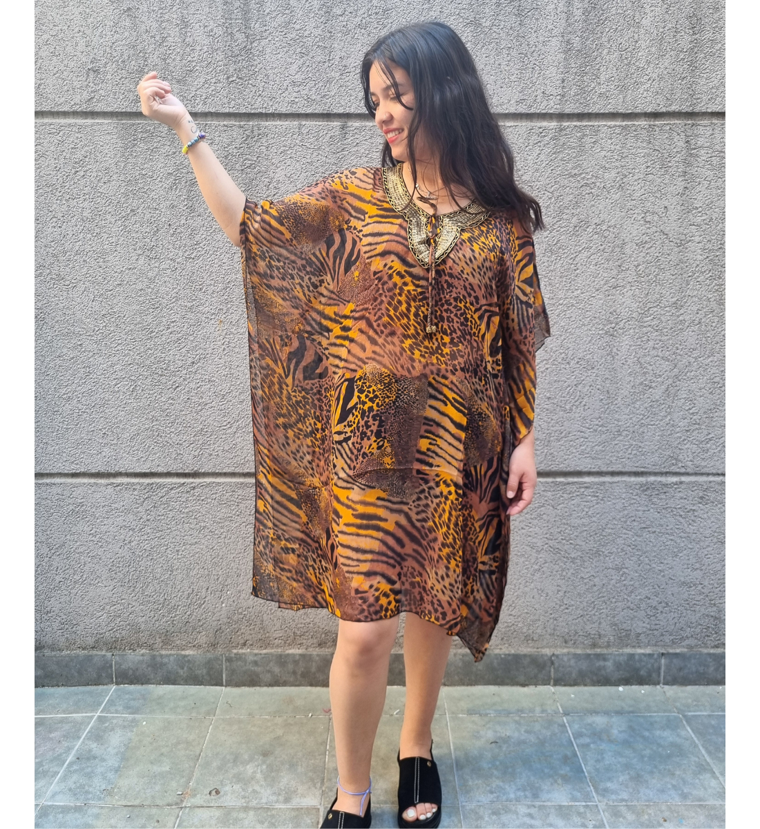 Blusa Vestido Poncho Animal Print cuello en V con canutillos