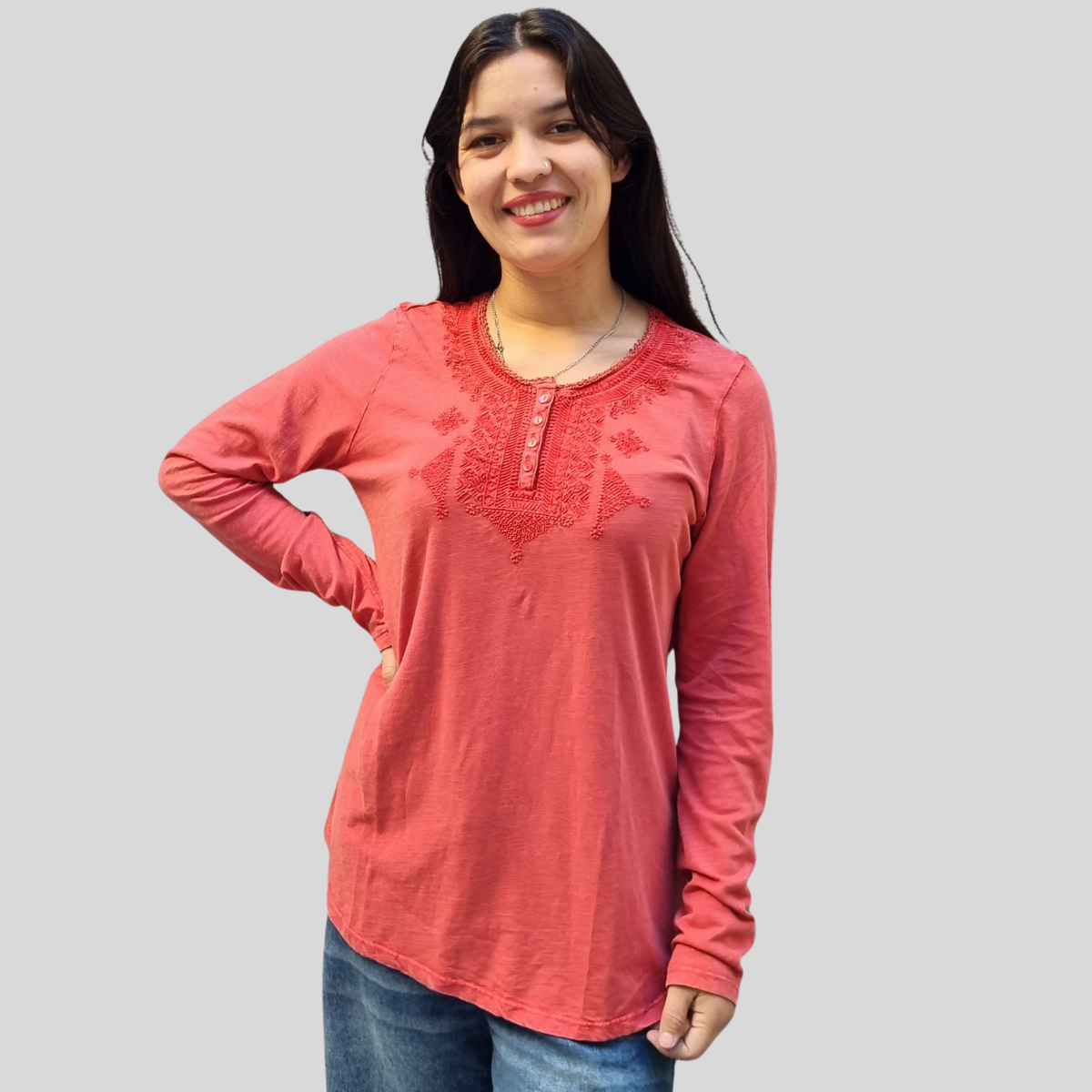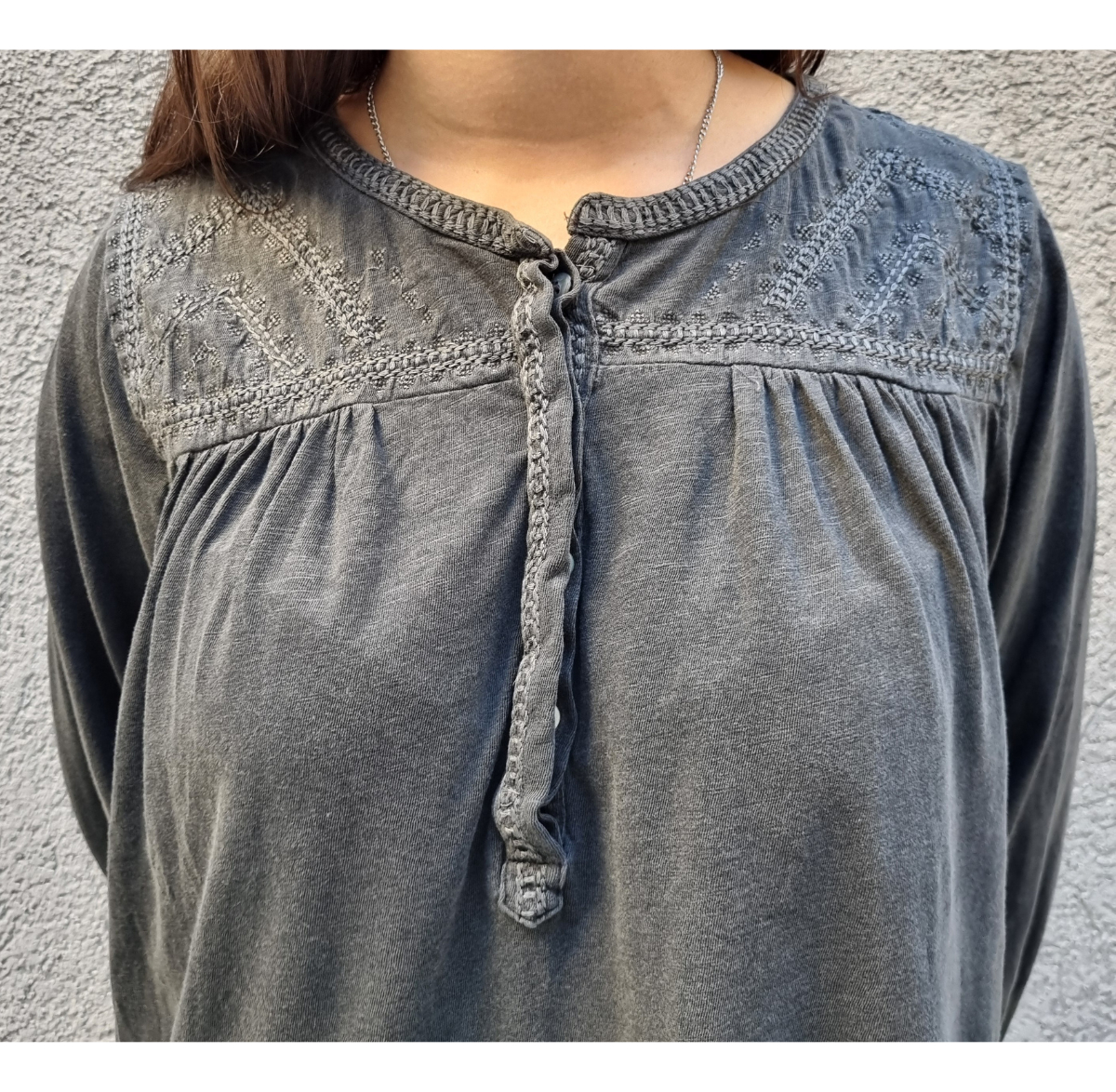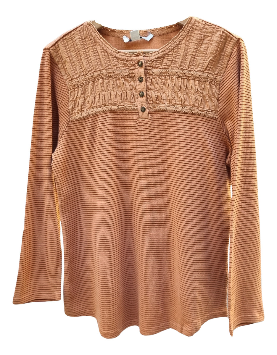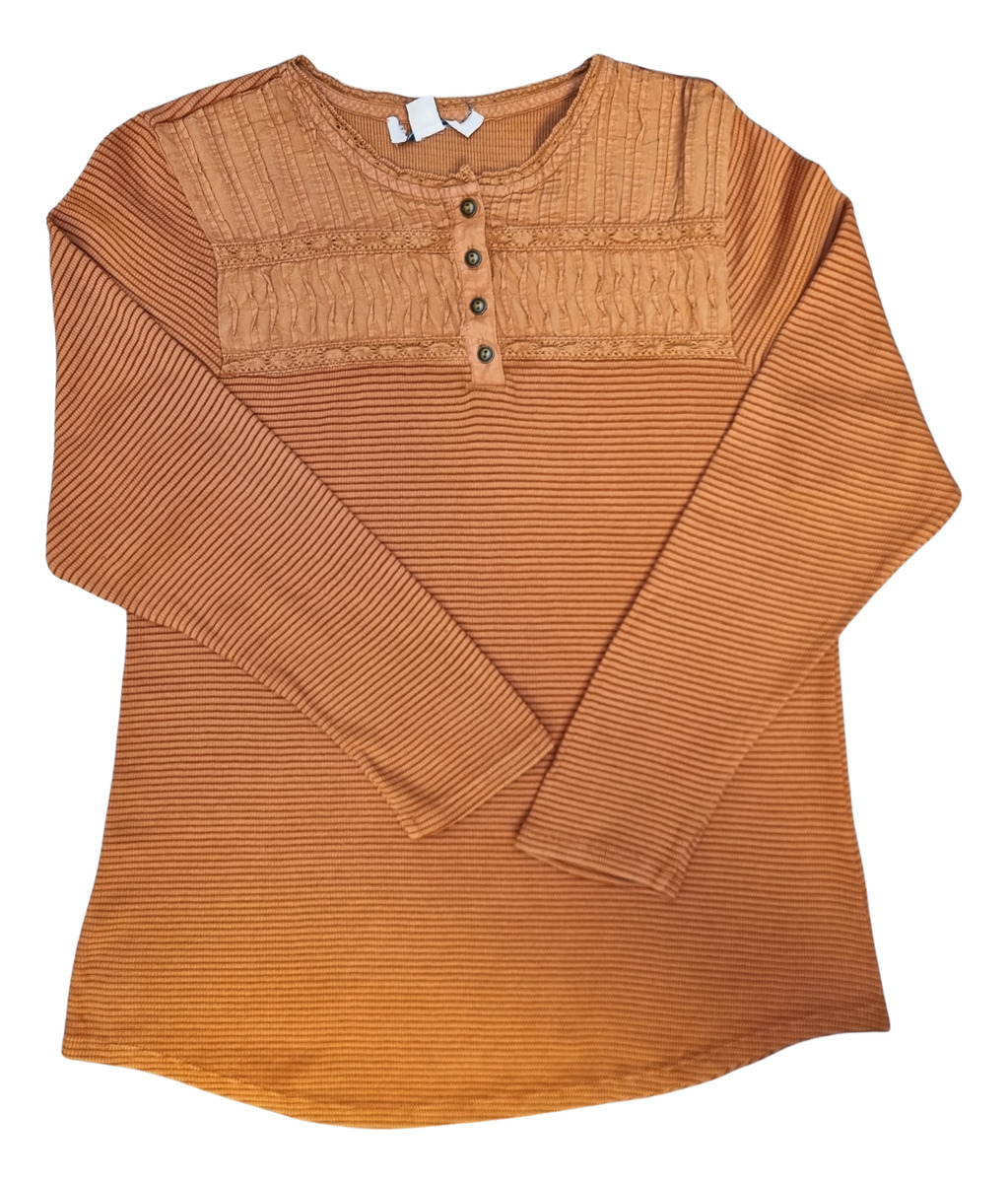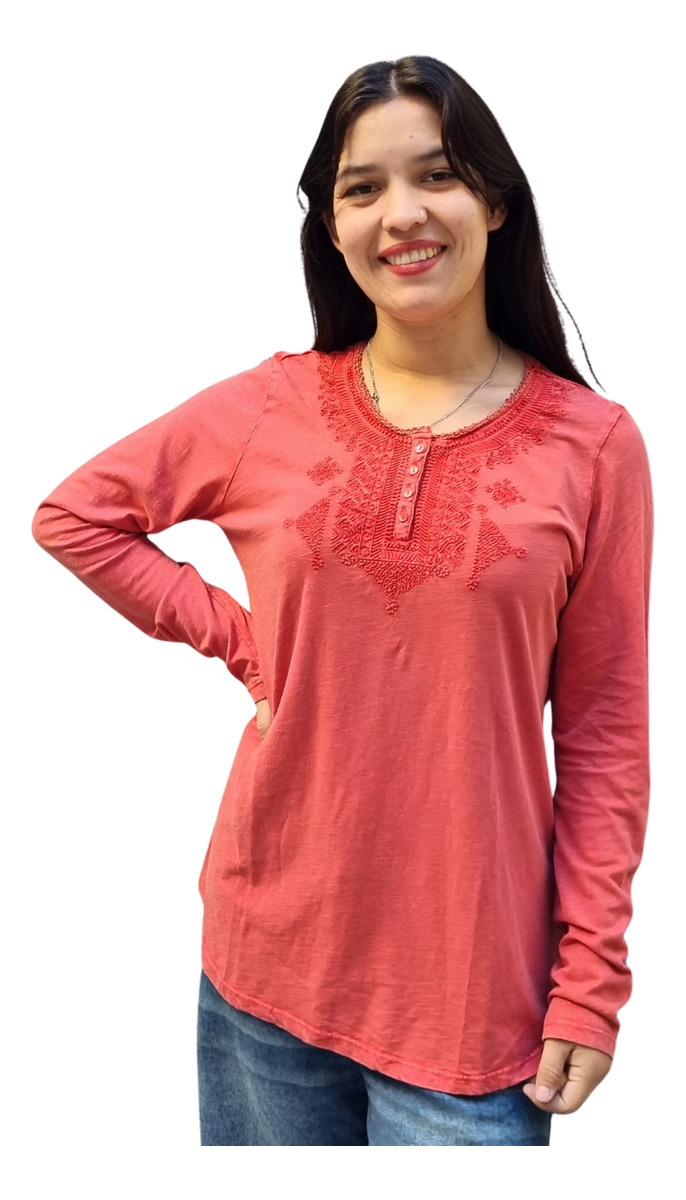 CAMISETA TEXTURADA MANGA LARGA CUELLO BORDADO 4 BOTONES