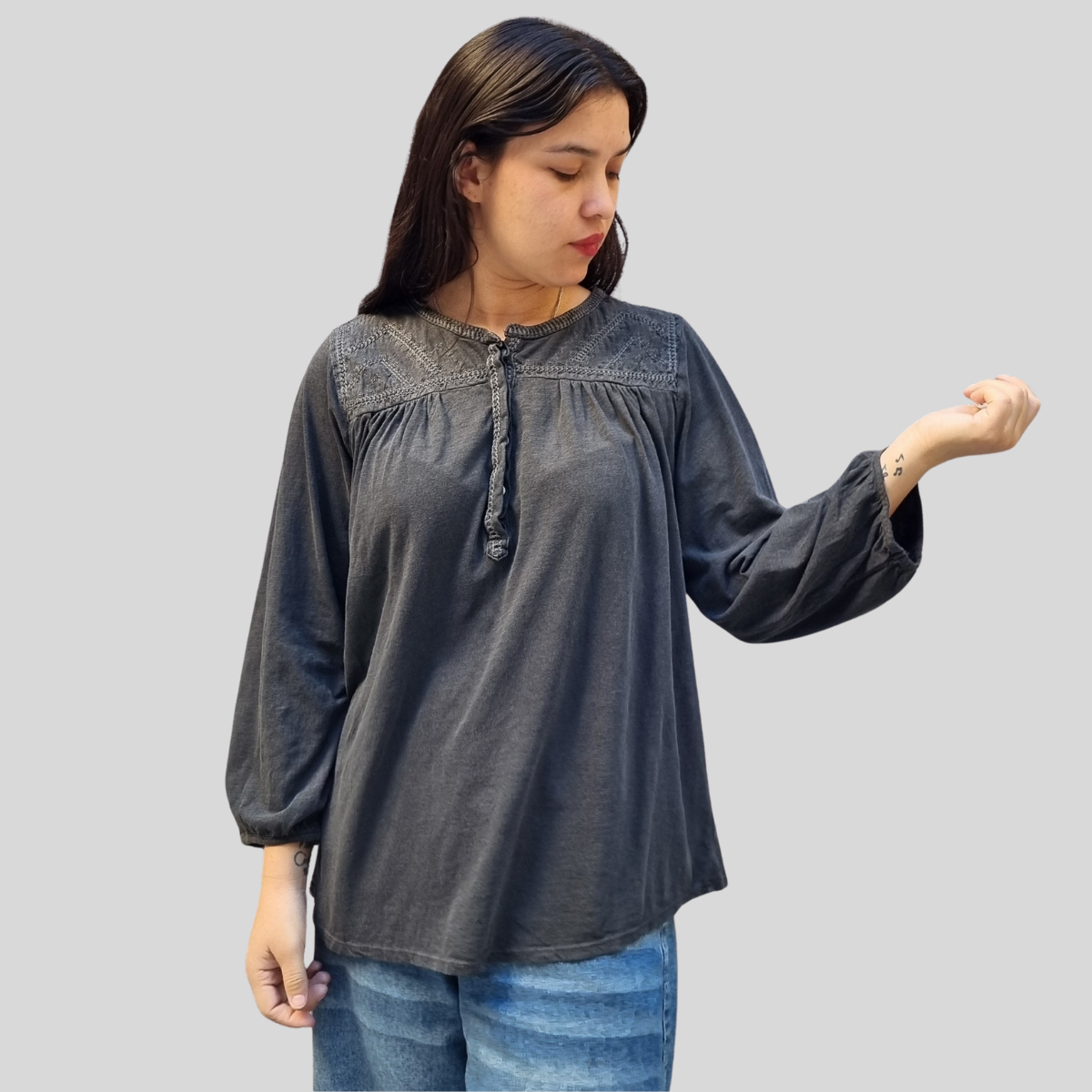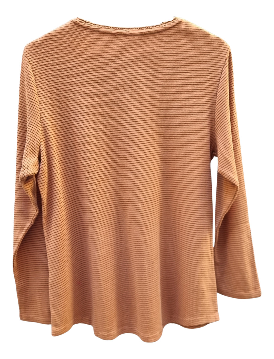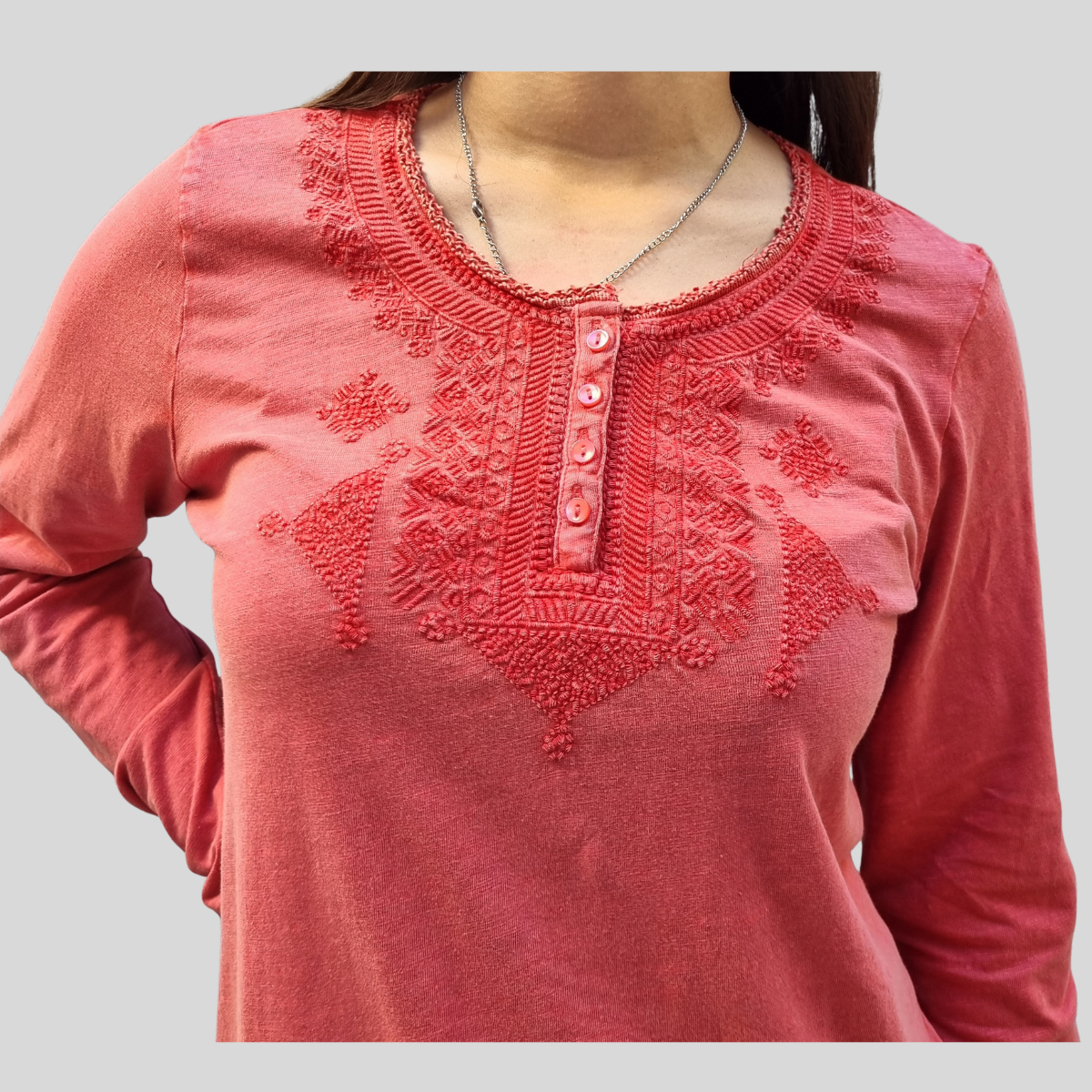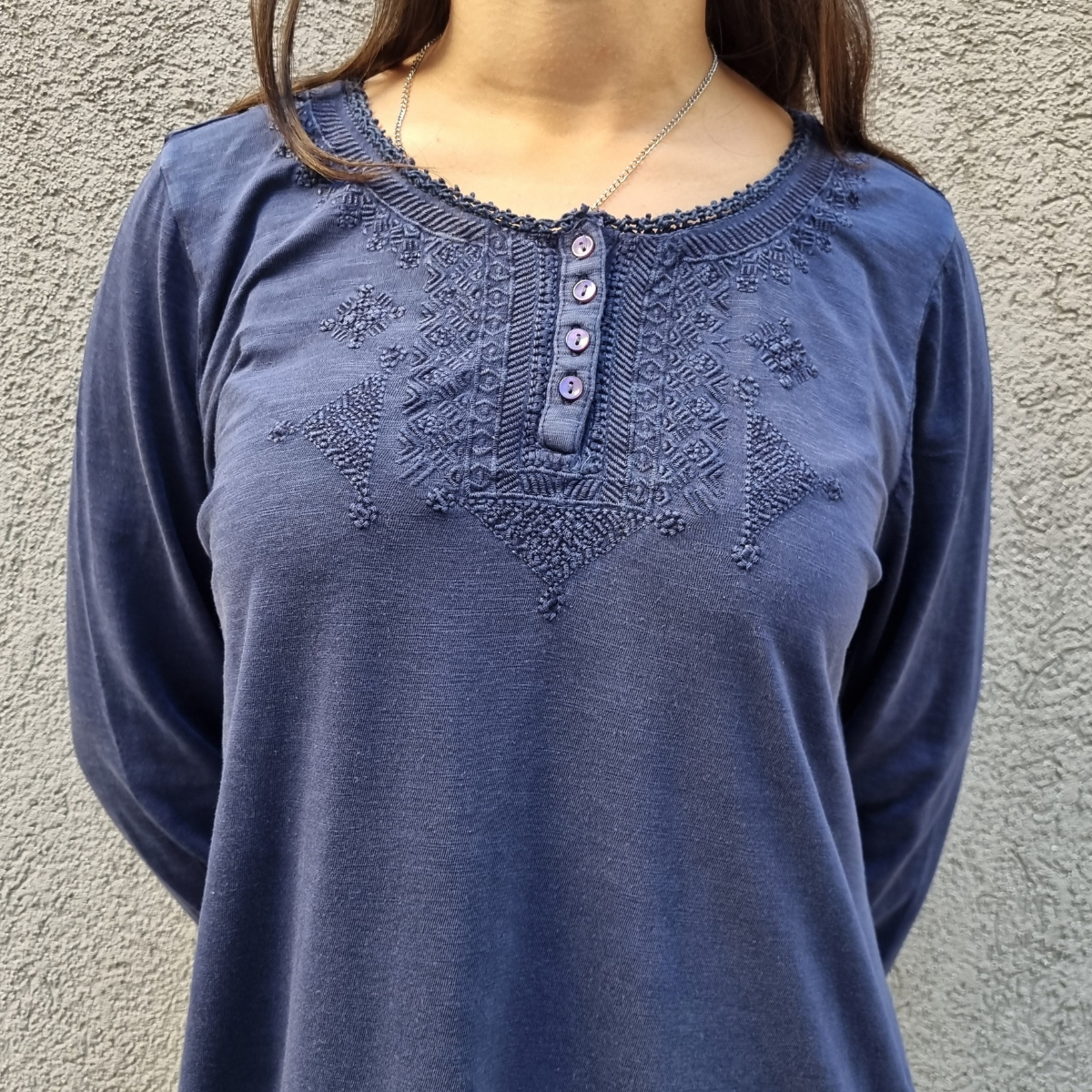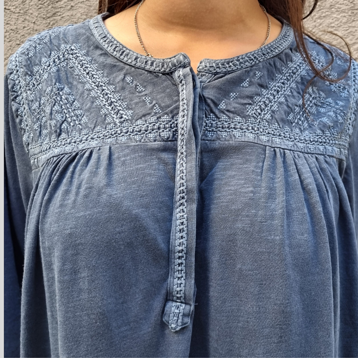 CAMISETA TEXTURADA MANGA LARGA CUELLO BORDADO 4 BOTONES