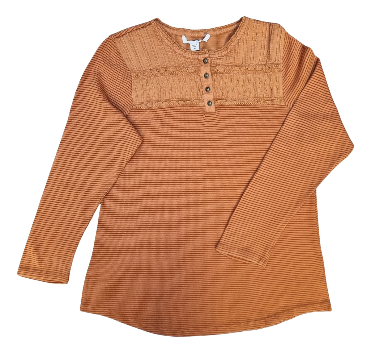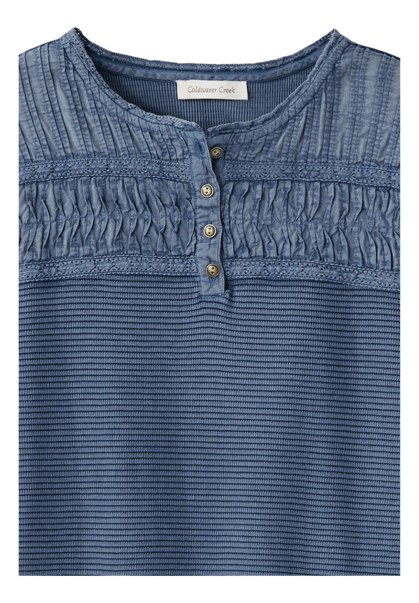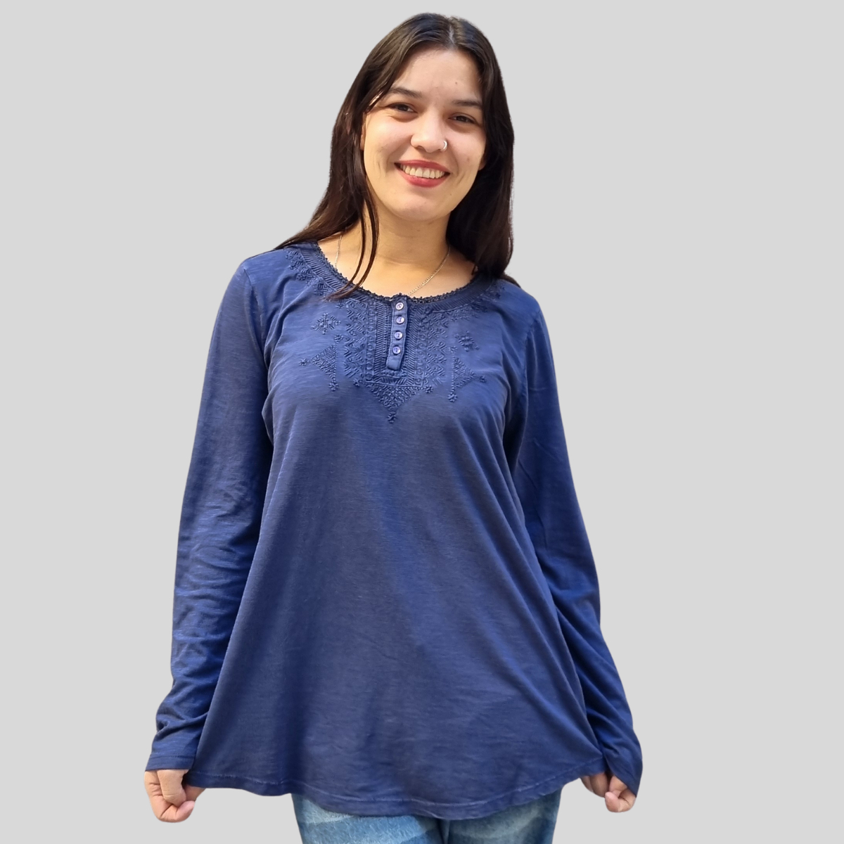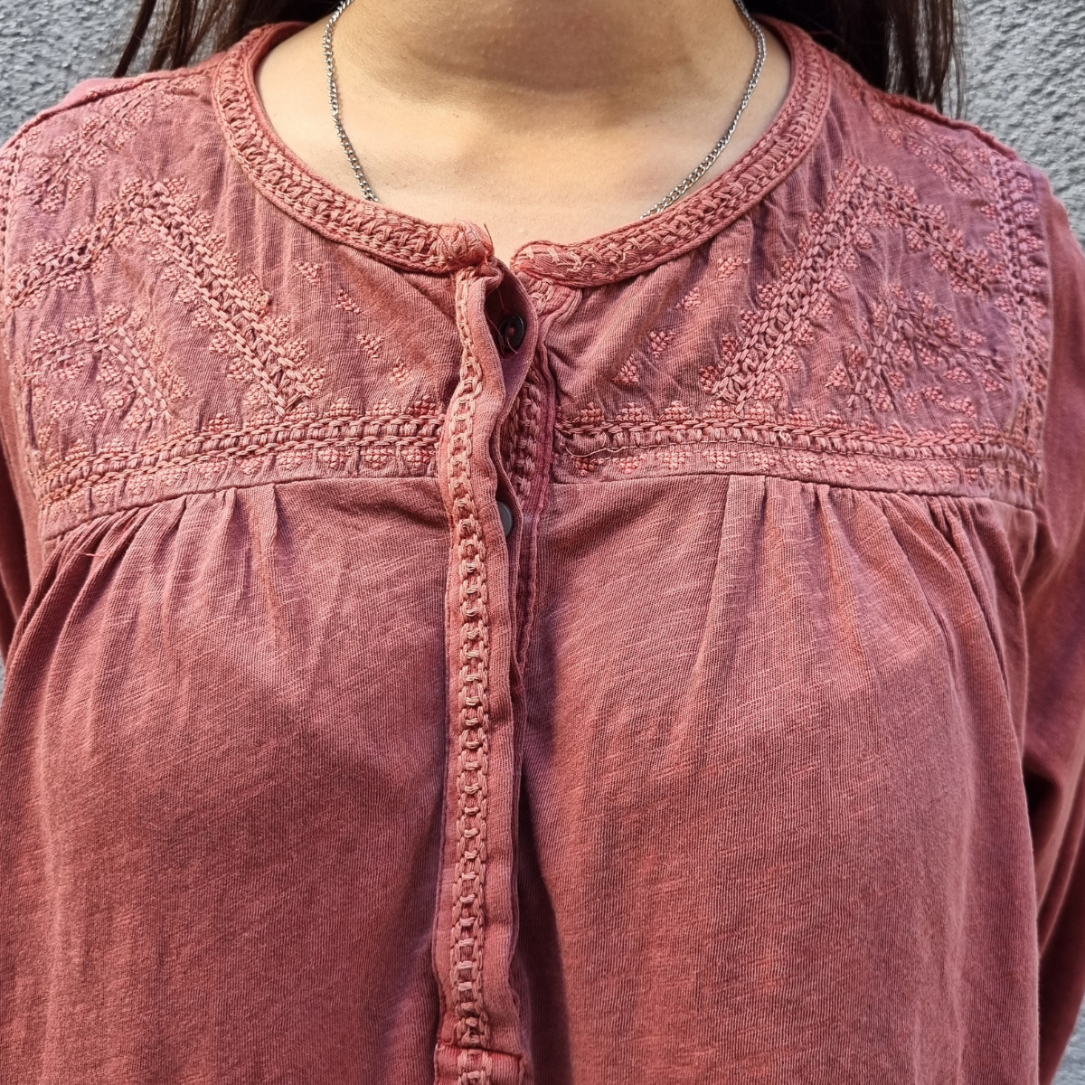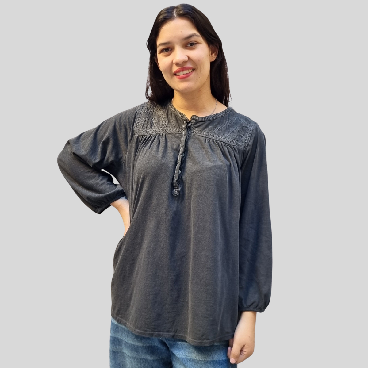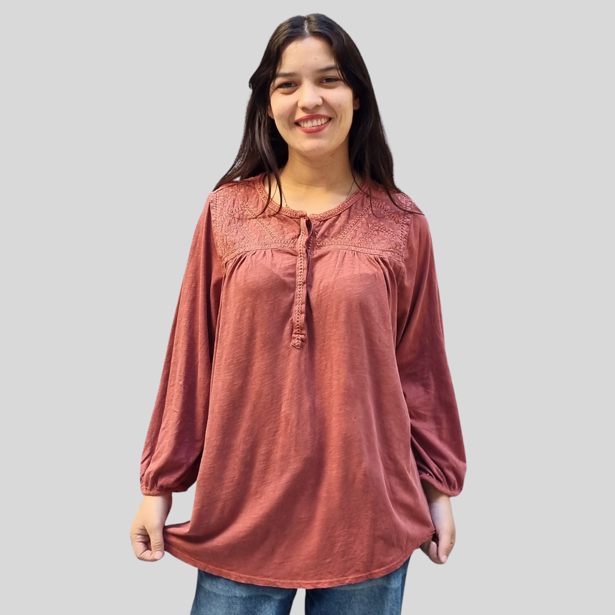 CAMISETA TEXTURADA MANGA LARGA CUELLO BORDADO 4 BOTONES