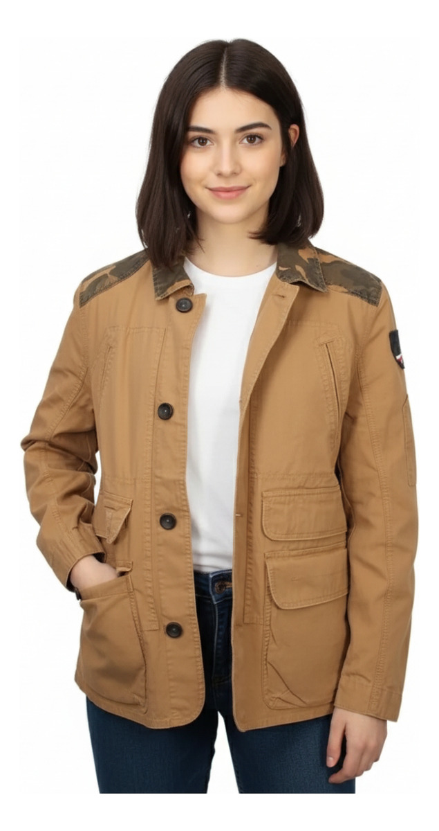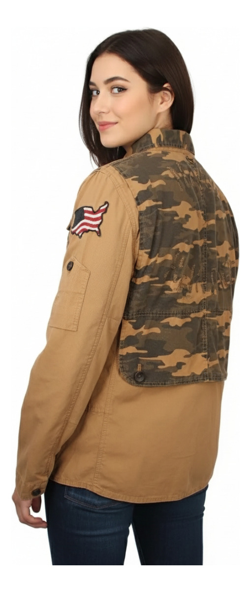Modelo Mostaza: sin cierre, con botones, 4 bolsillos externos, estampado camuflado en la parte de atrás.