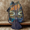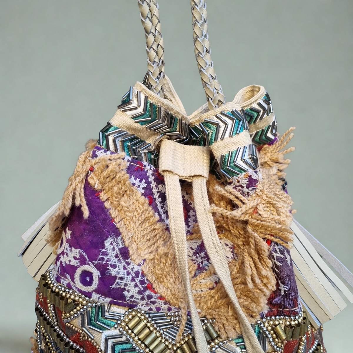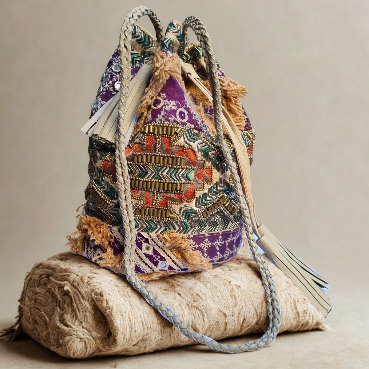 BOLSO CARTERA MOCHILA CON TIRANTE LARGO BORDADO EN HILO Y CANUTILLOS. EL LOGO DE MARCA ESTÁ BORDADO POR DENTRO