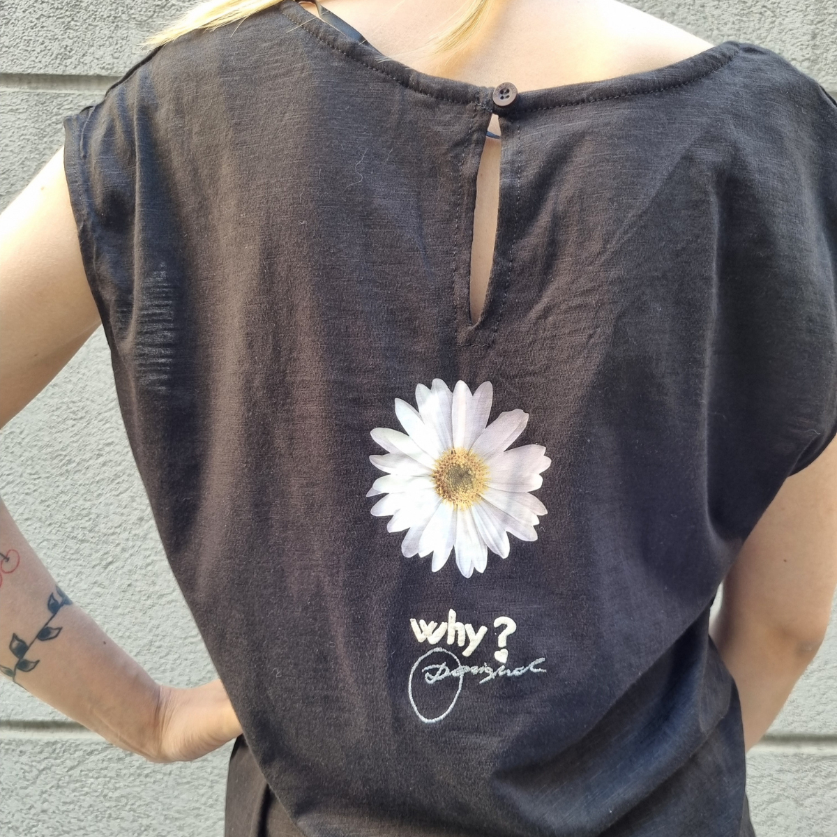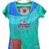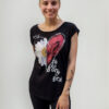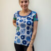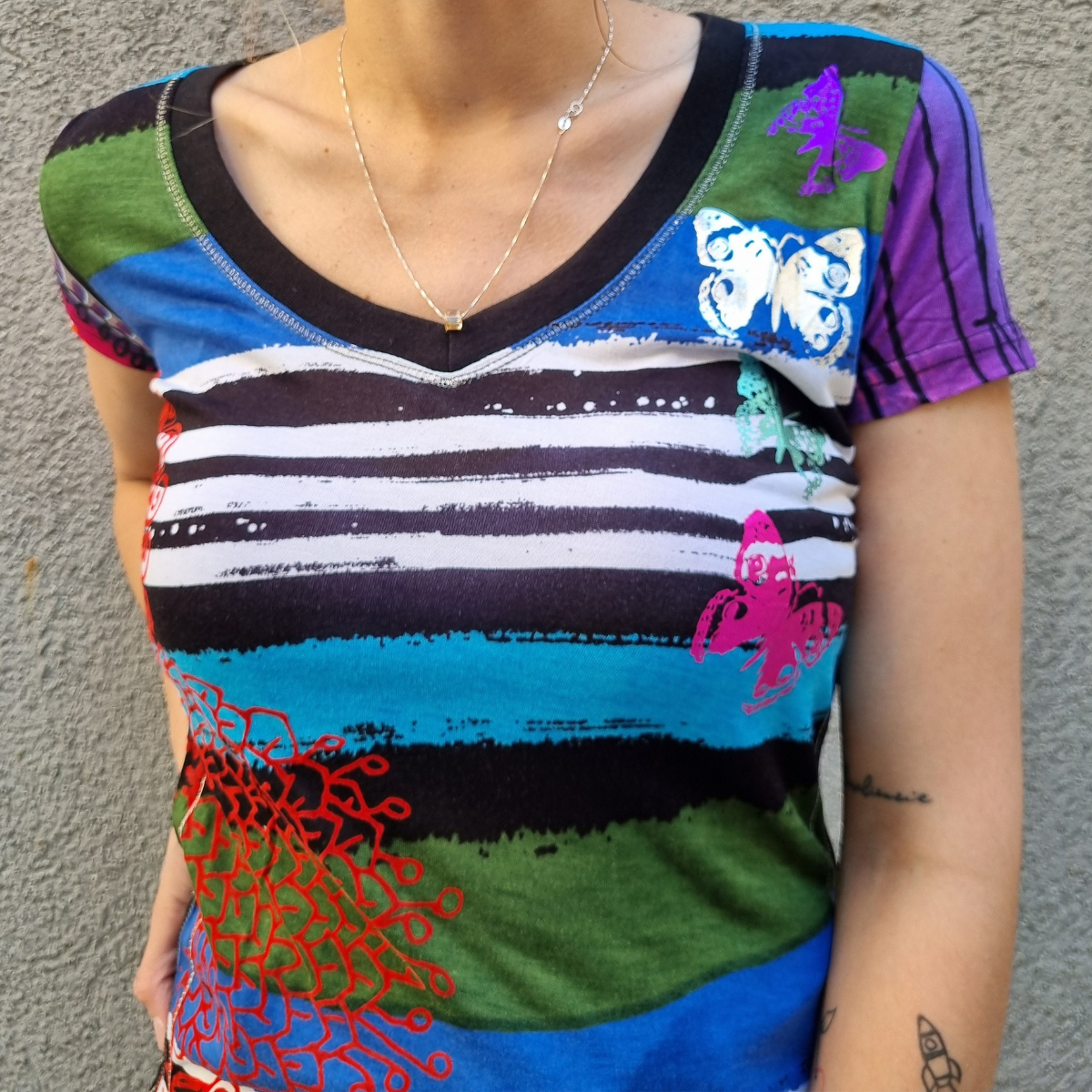 Remera estampada con motivos circulares adelante y rayada atrás.