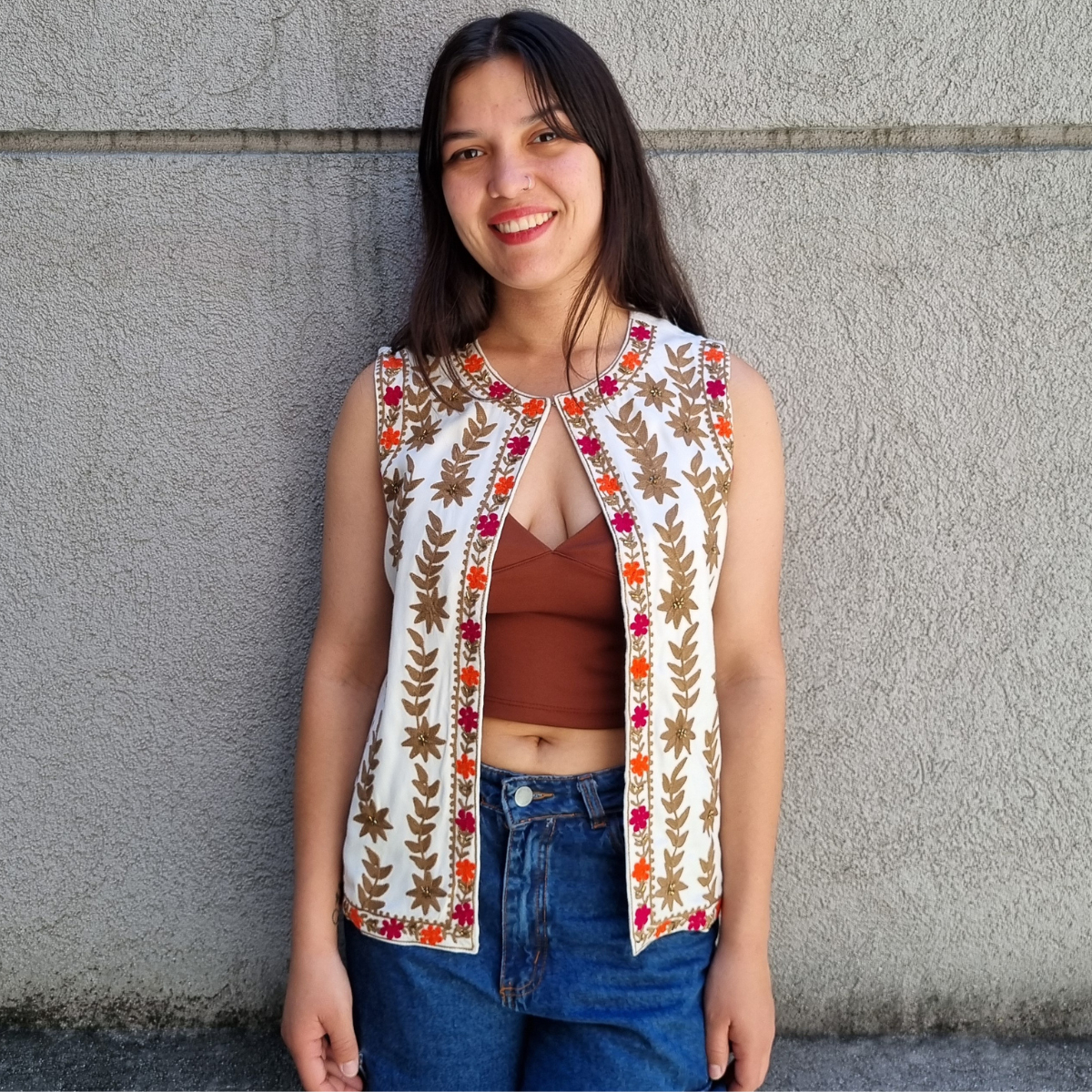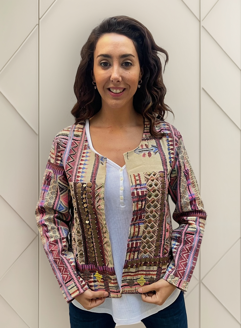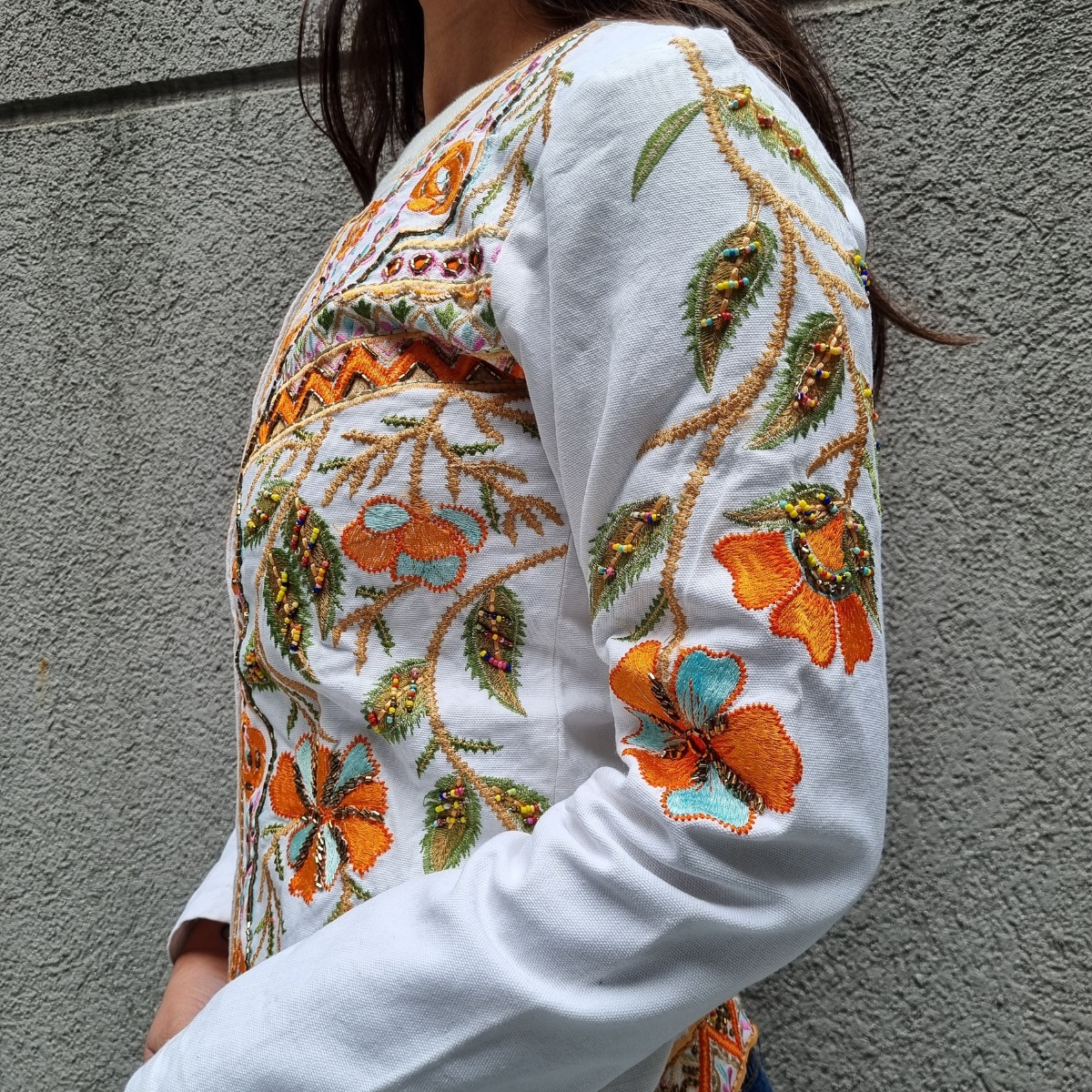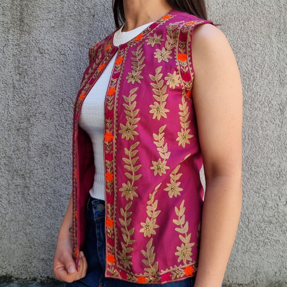 Chaqueta hindú bordada con canutillos y broches, abotonada y forrada.
