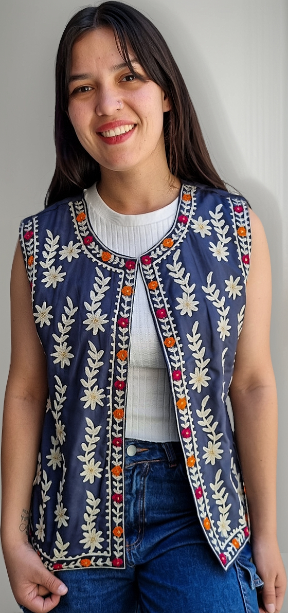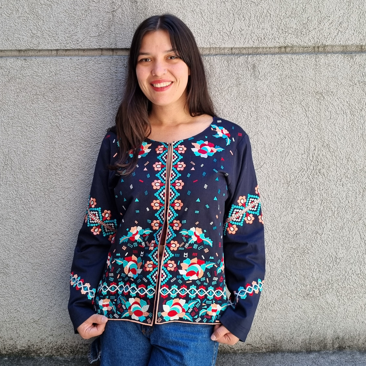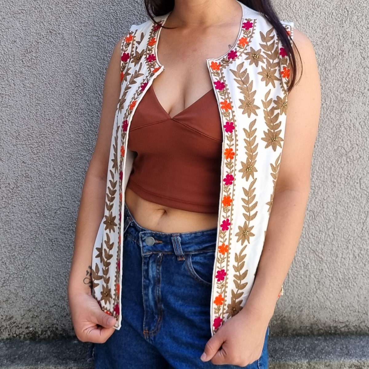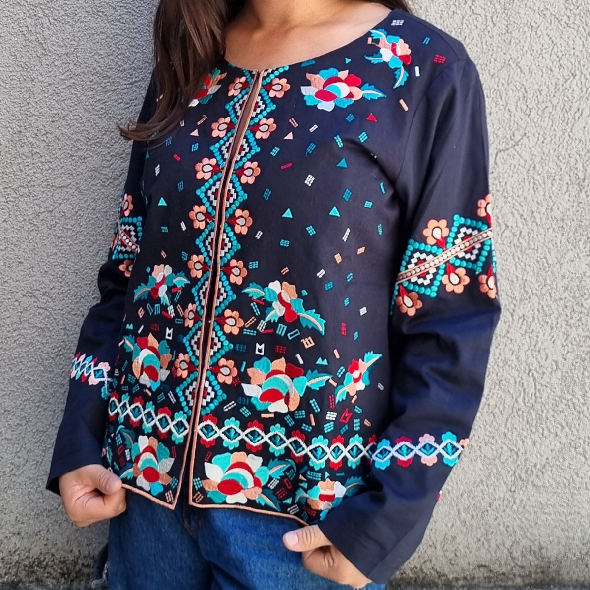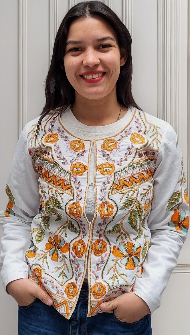 Chaqueta hindú bordada con canutillos y broches, abotonada y forrada.