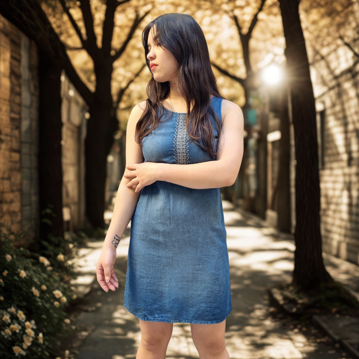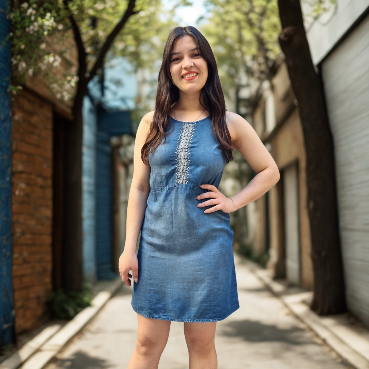 VESTIDO JEAN DENIM SIN MANGA CORTO PECHO BORDADO