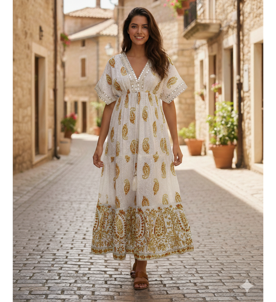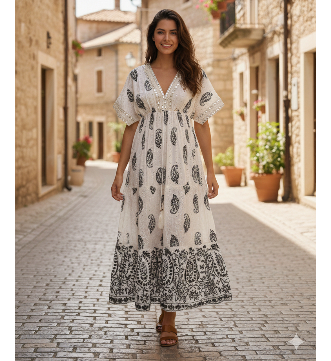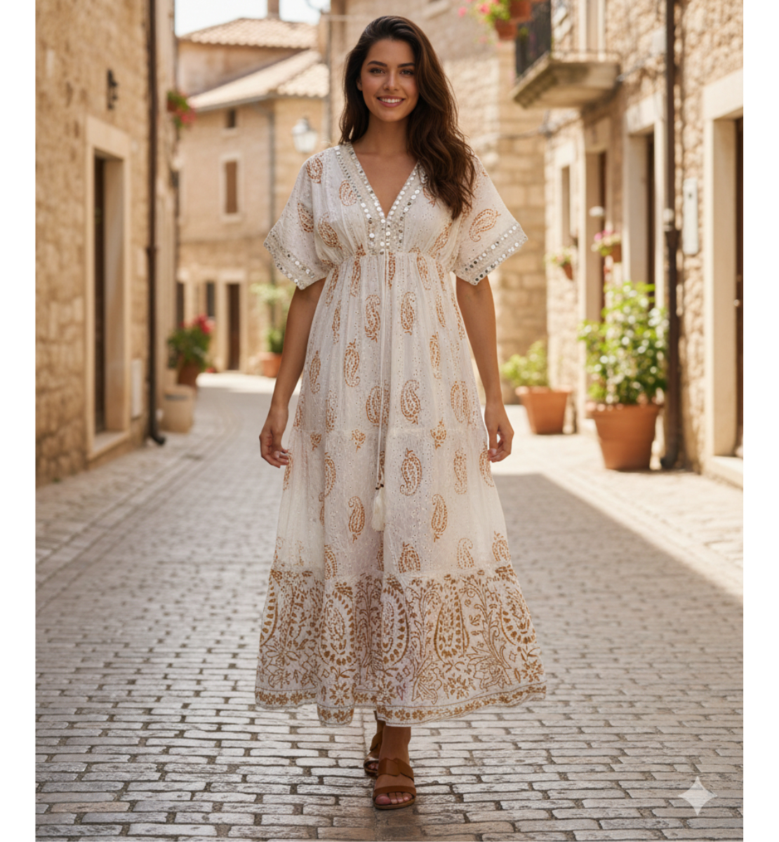 VESTIDO LARGO BORDADO BRODERIE MANGA CORTA