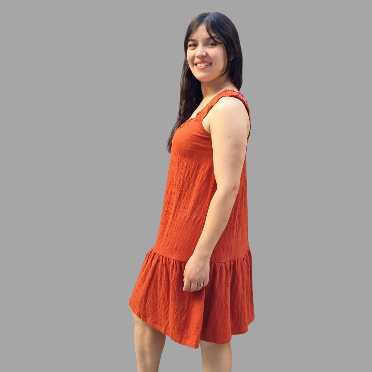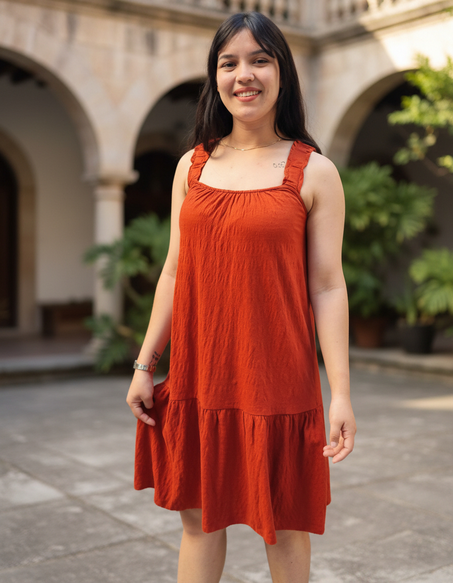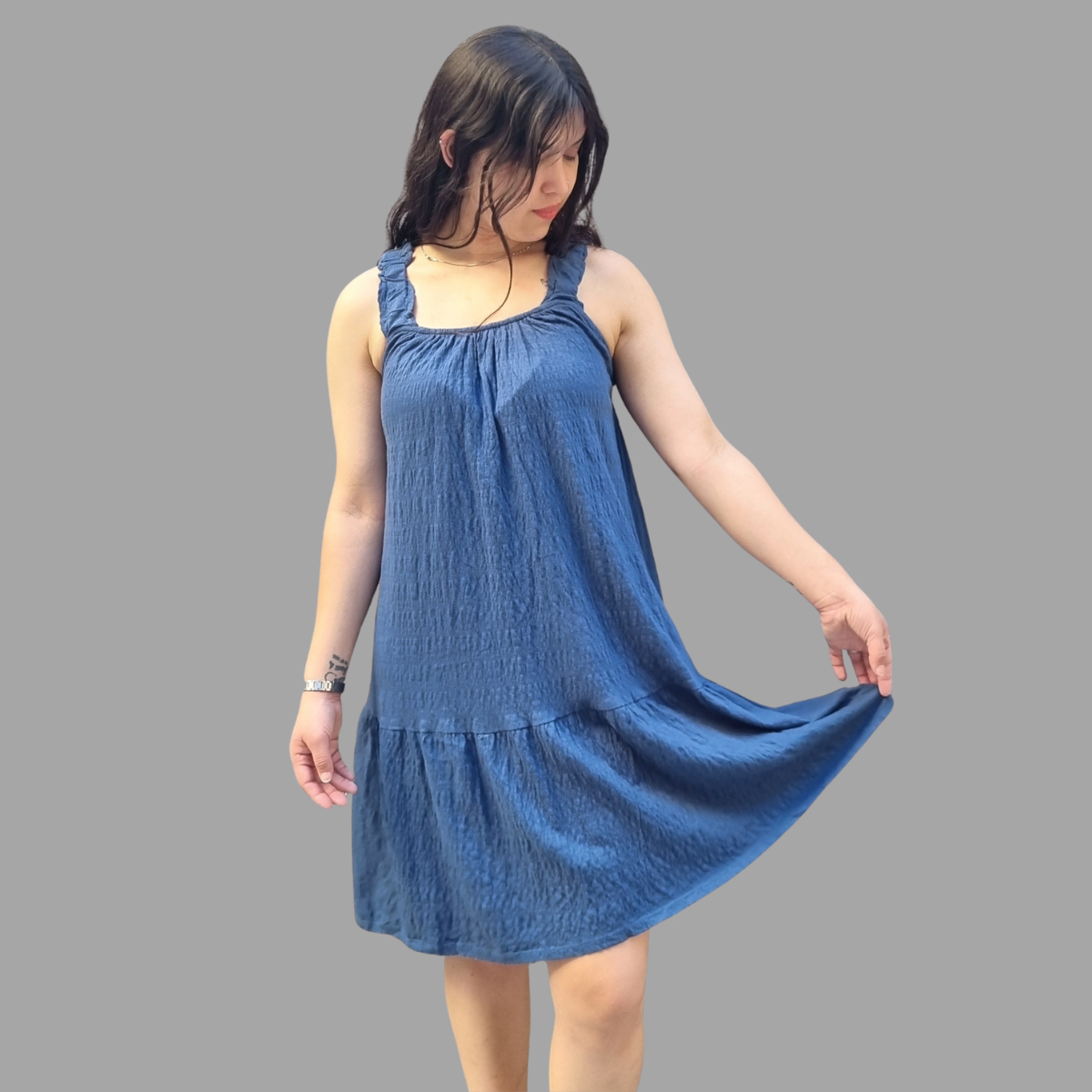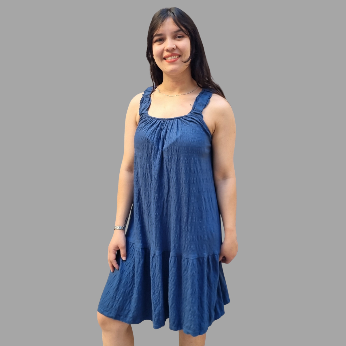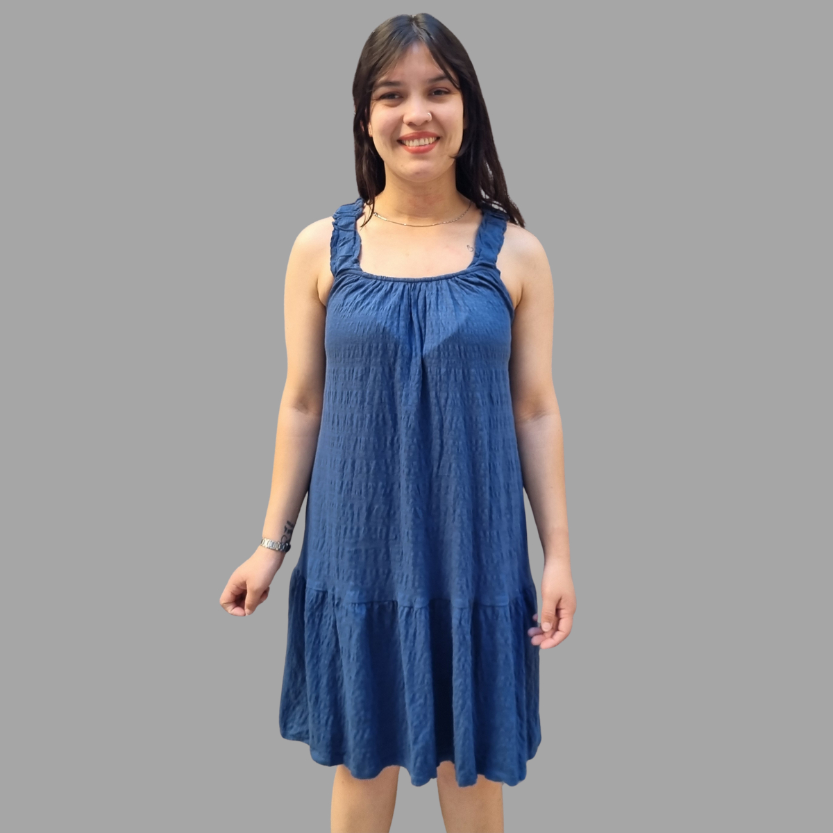 VESTIDO CORTO SUAVE AMPLIO CON TIRANTES ELASTIZADOS TERMINACIÓN VOLADOS