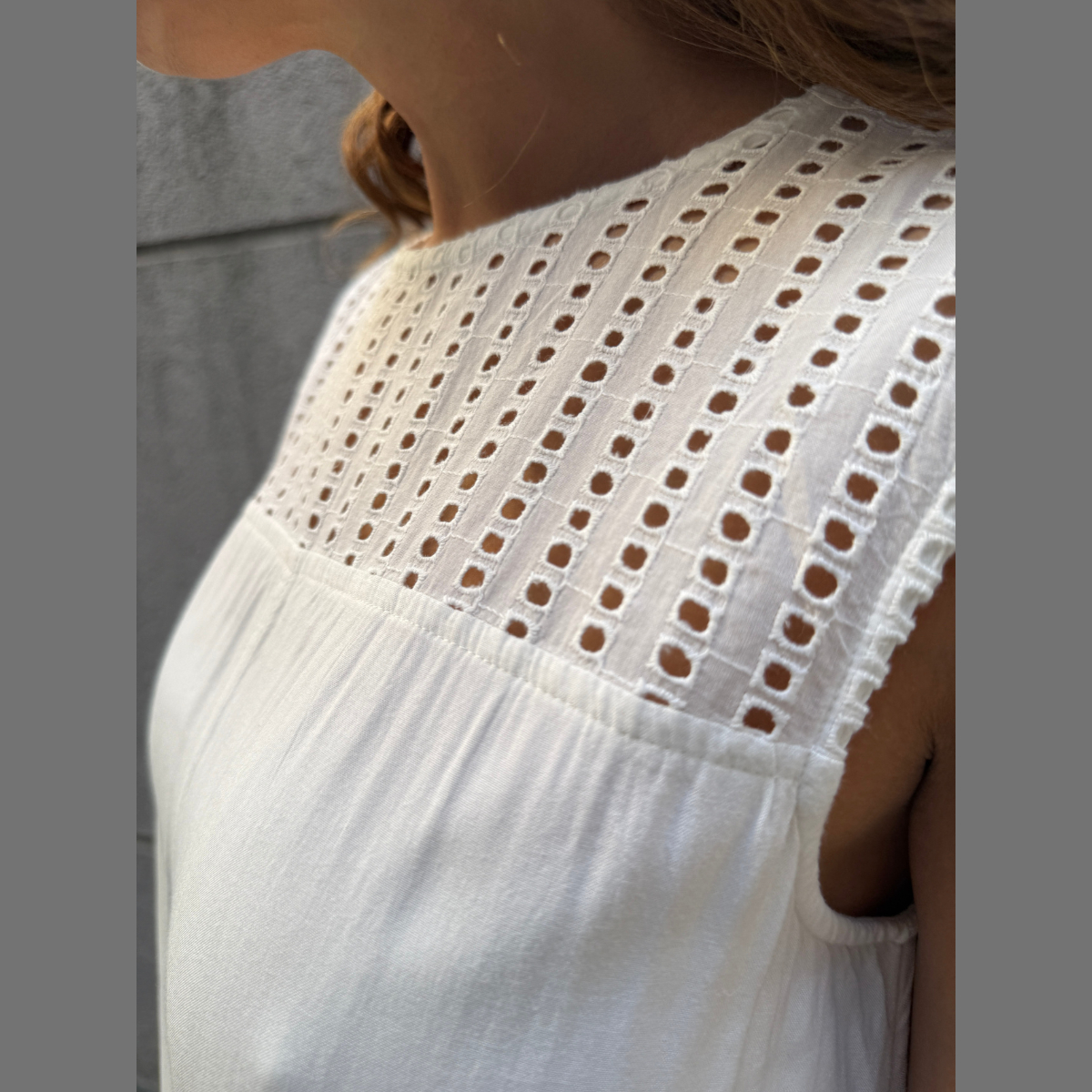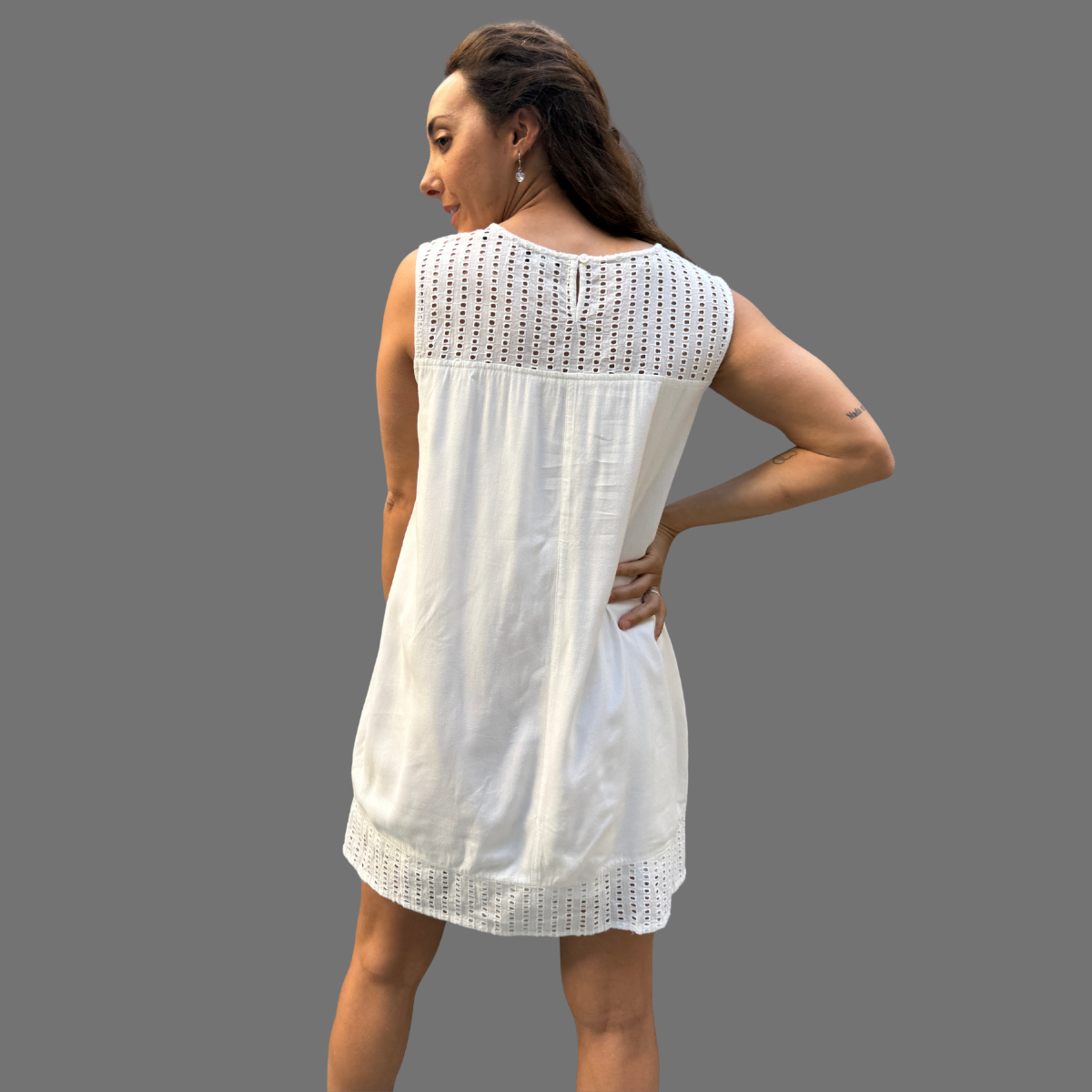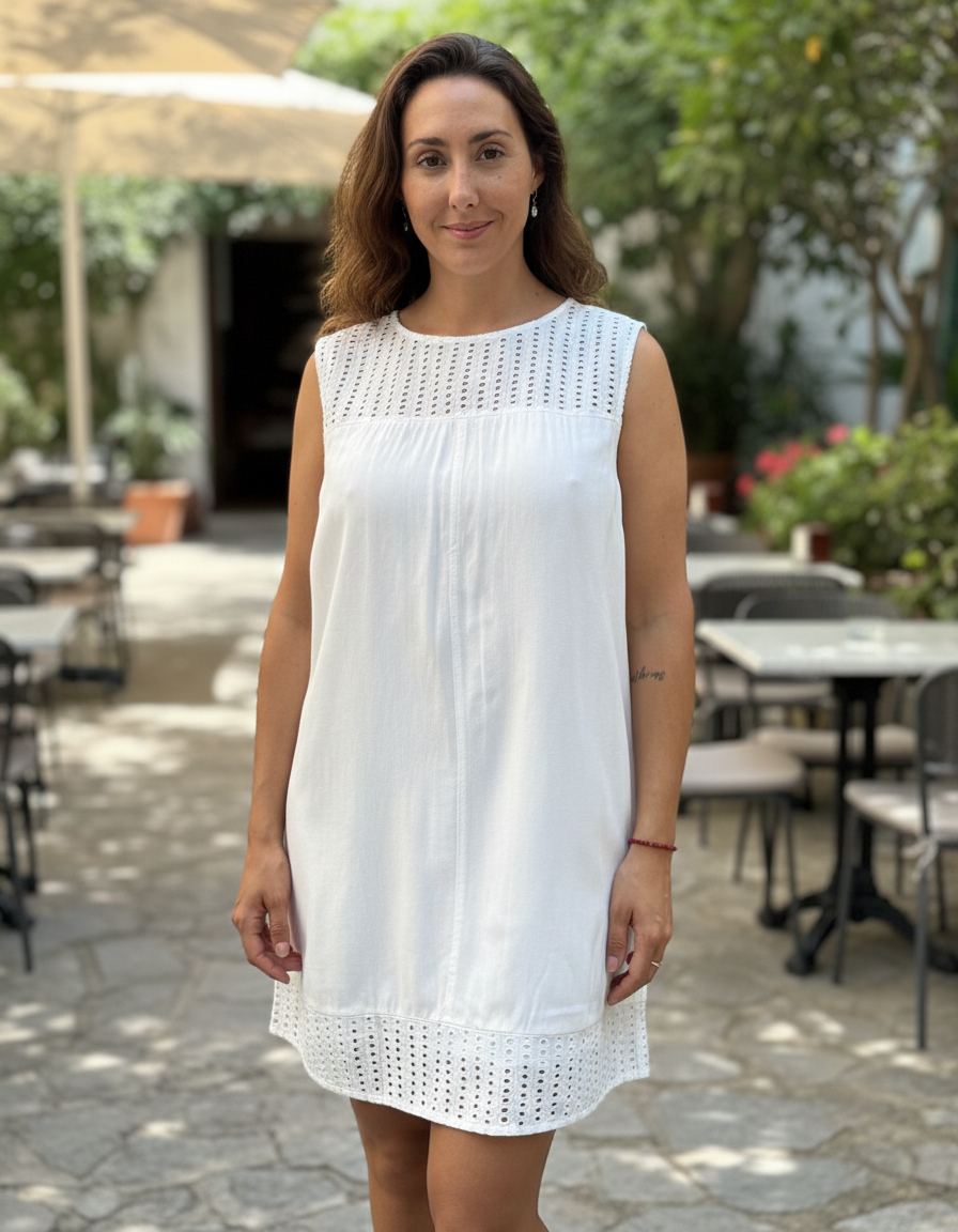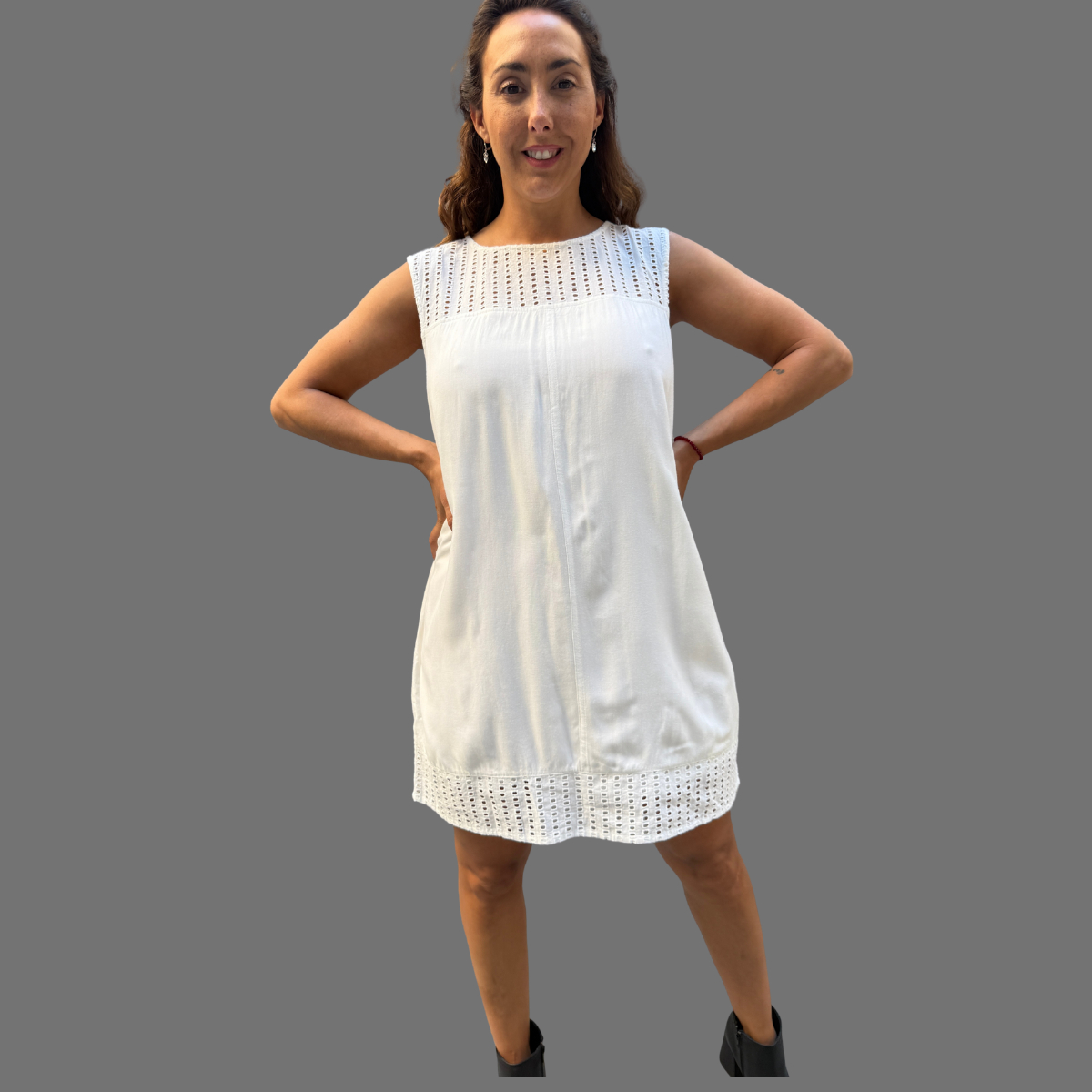 VESTIDO CORTO SM DETALLE CALADO EN HOMBRO Y FALDA. Con FORRO INTERNO
